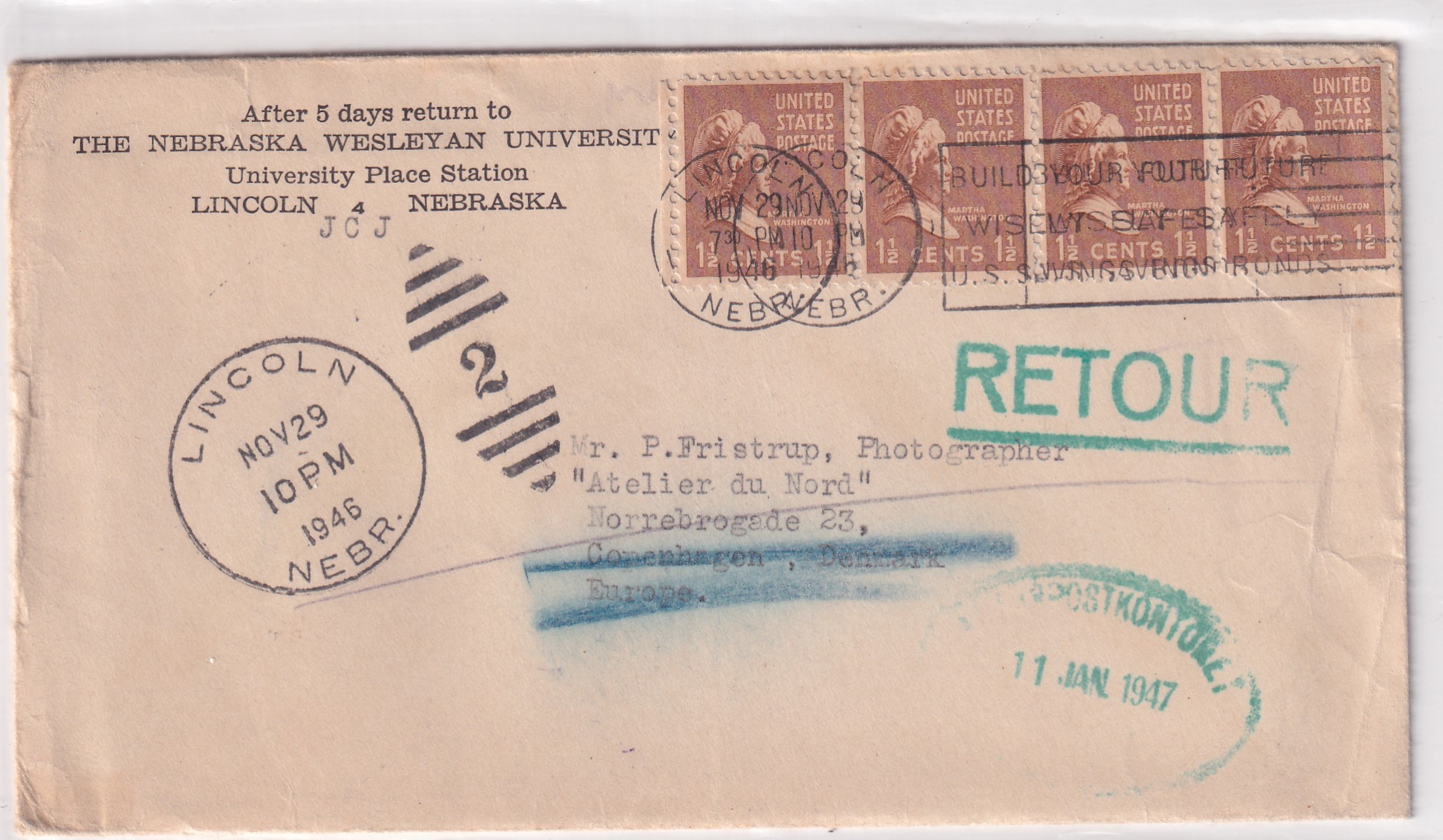 1946 Lincoln, Ne to Copenhagen, Denmark RTS, 1 1/2c Prexies x 4.