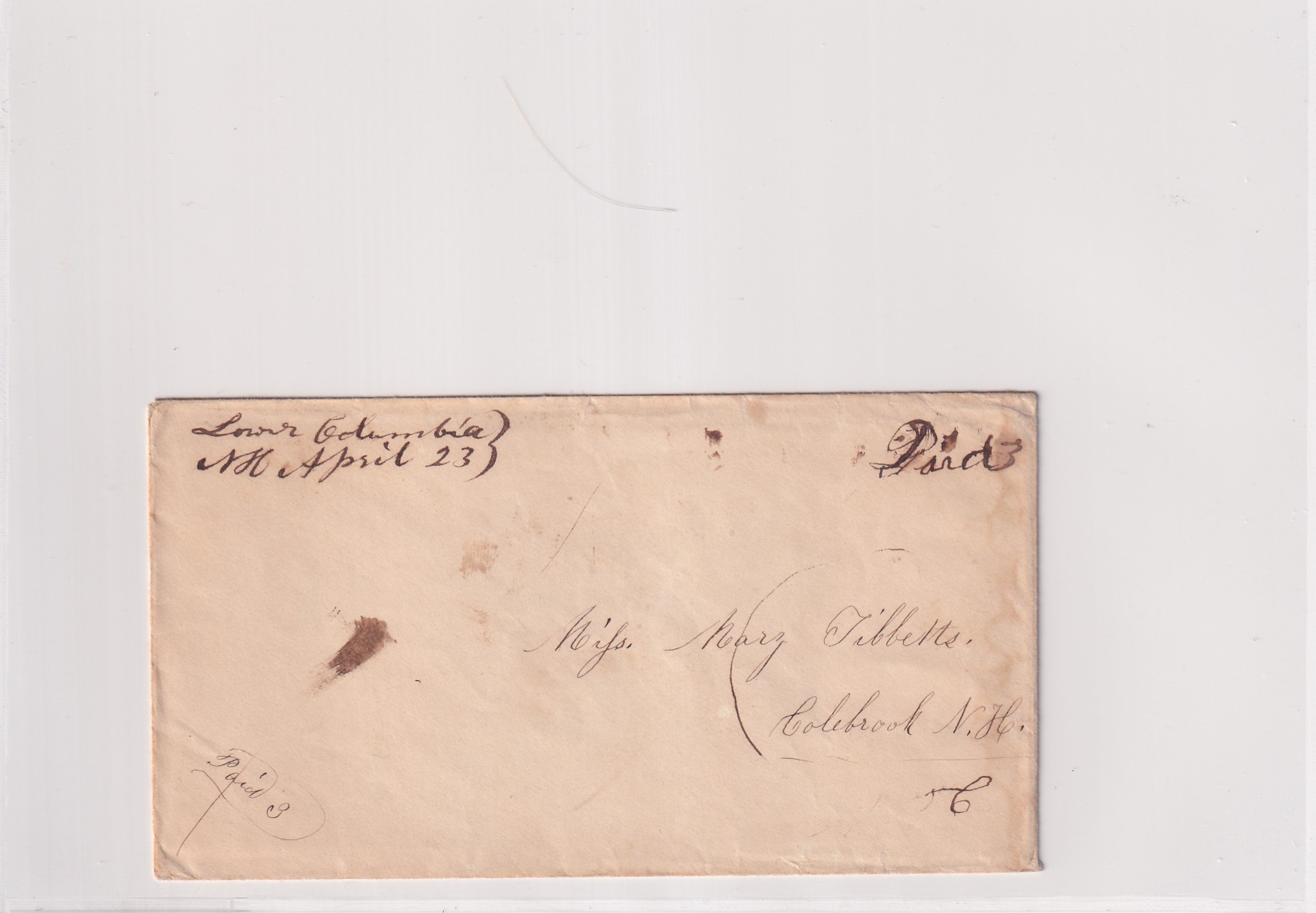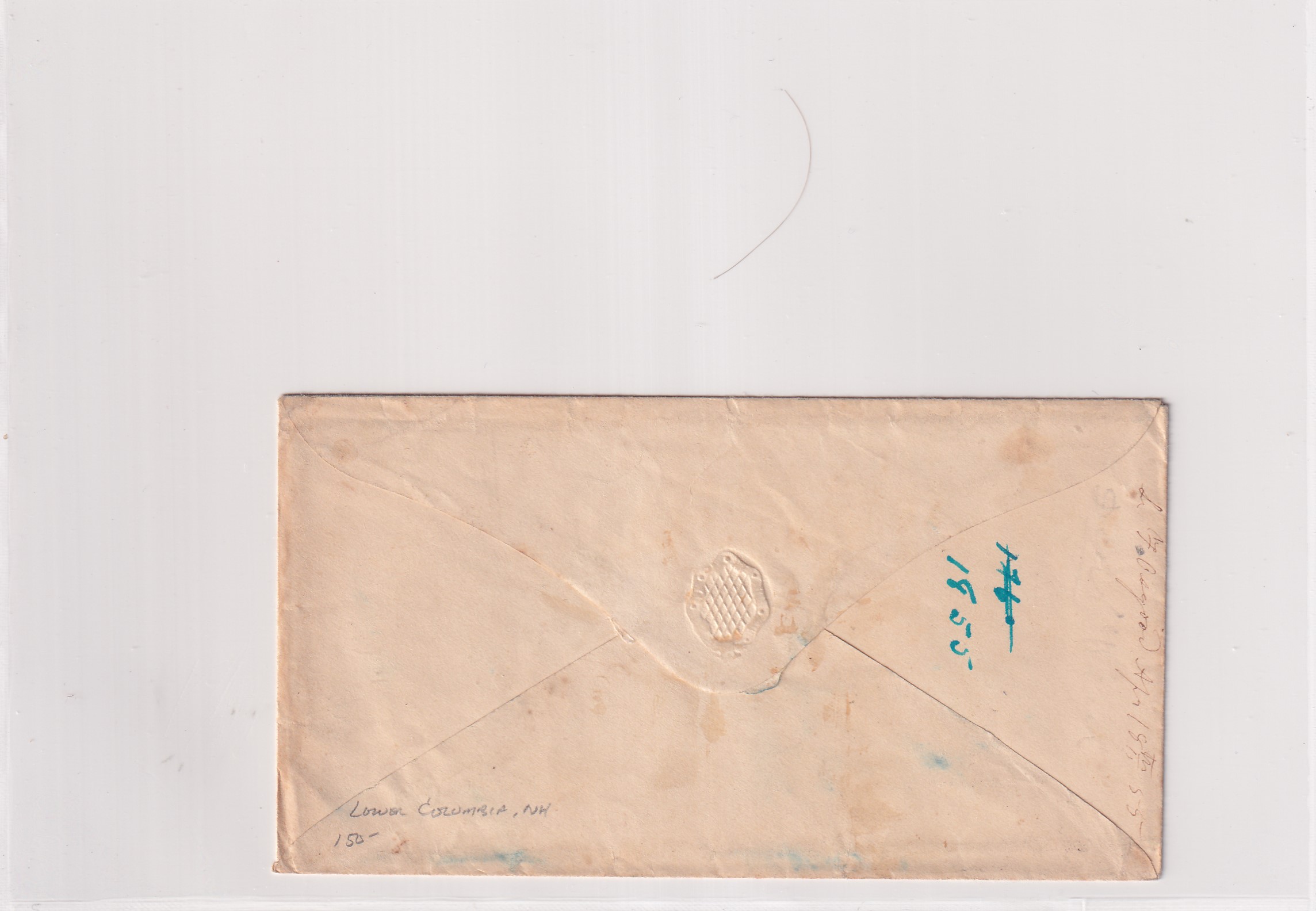 Stampless: 1855 Lower Columbia to Colebrook, NH Manuscript canx.