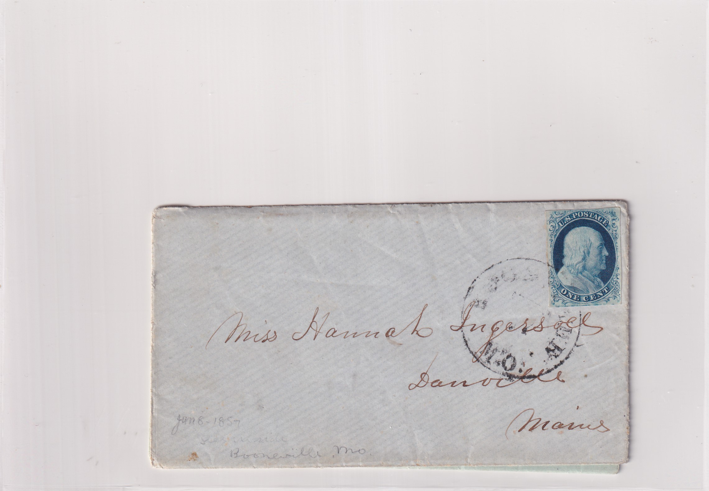 1857 Booneville, Mo to Danville,, Me Printed Matter enclosed.