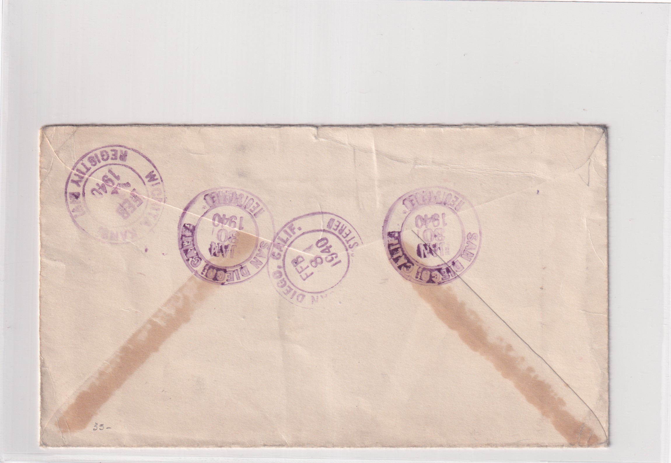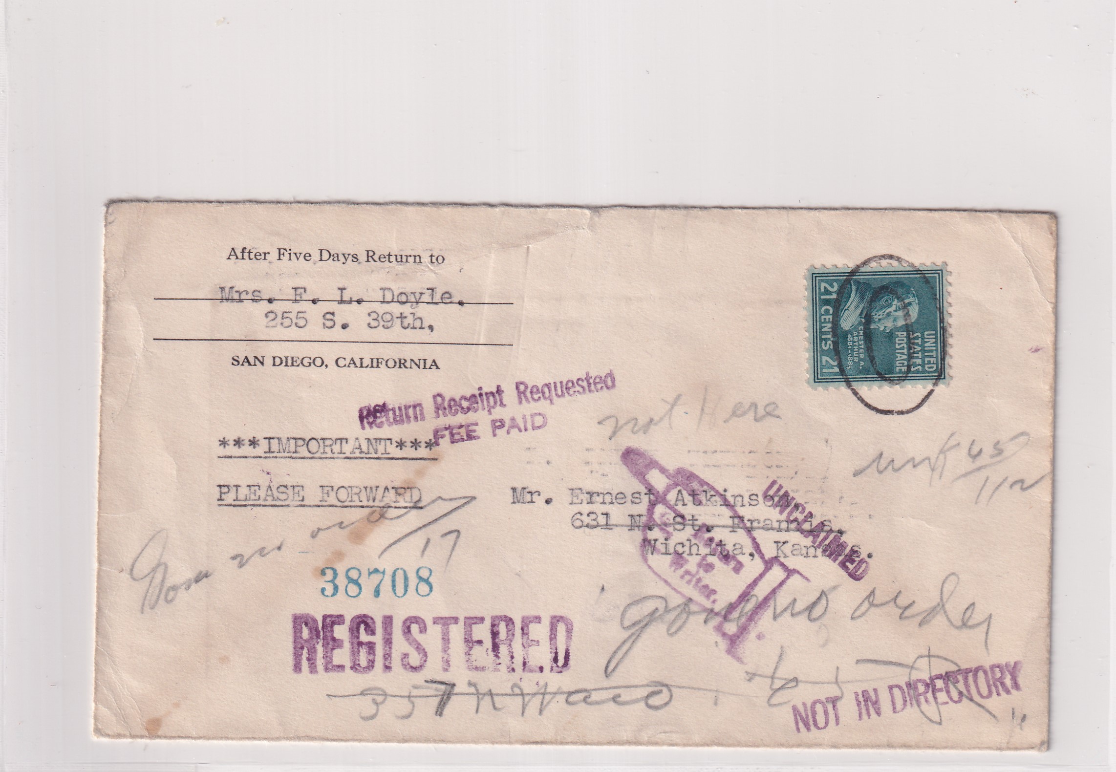1940 San Diego, Ca to Wichita, Ks Registered Return Receipt, solo 21c Prexie. back stamped San Diego & Wichita.