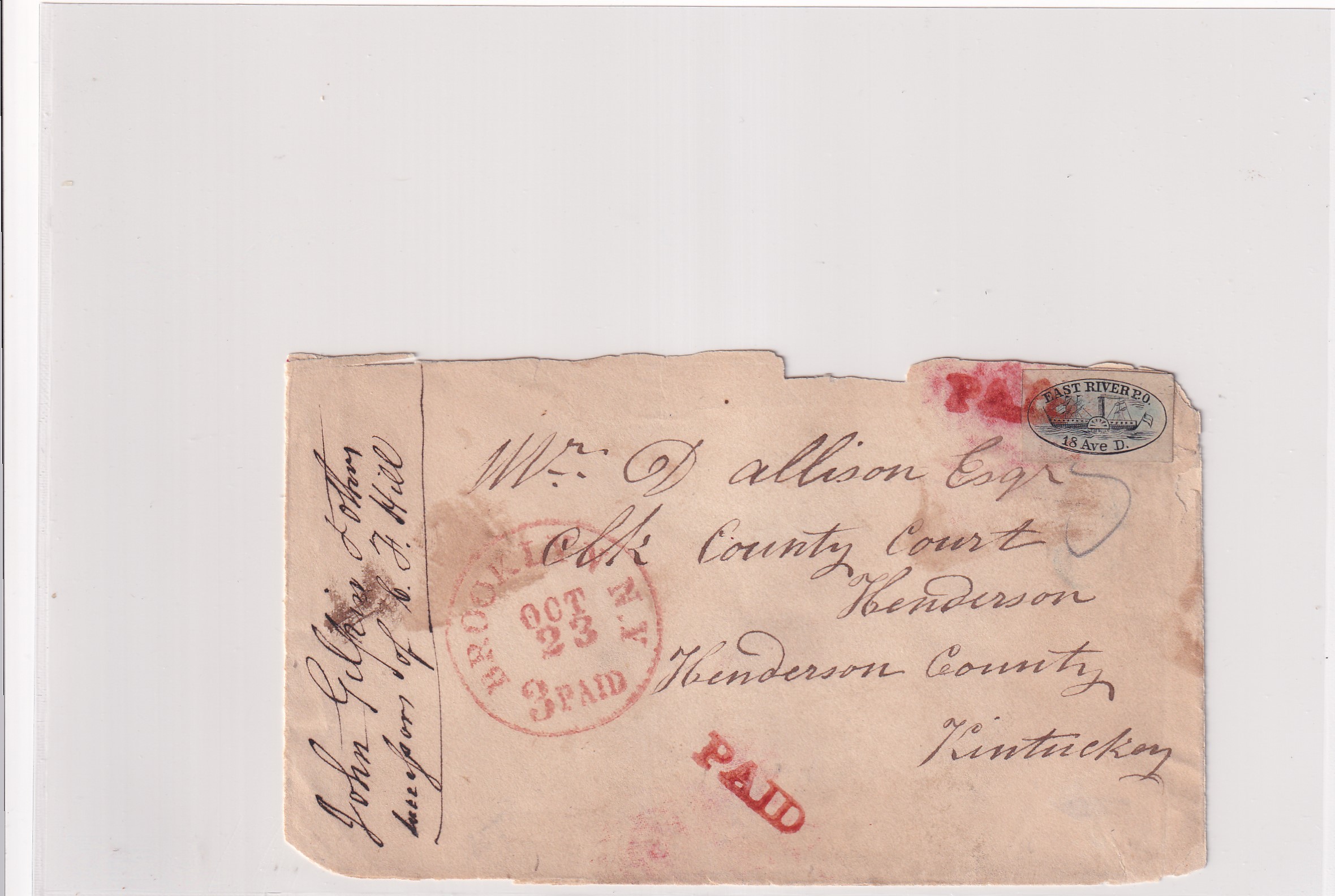 18xx Brooklyn, NY to Henderson, KY East River Local Sc #62L4. missing flap and damaged at the top. Cats $800 on cover. Stamp cats $250.