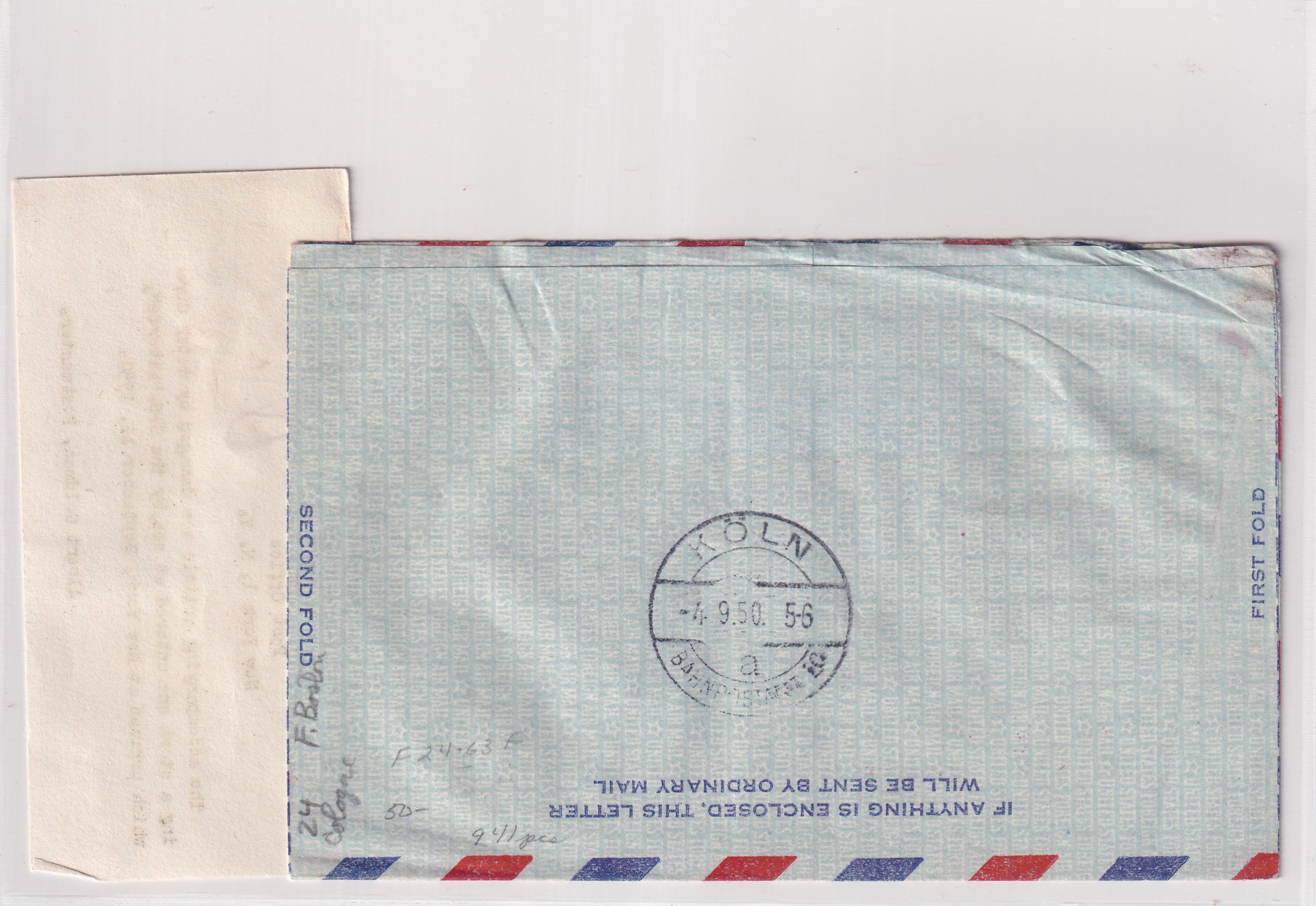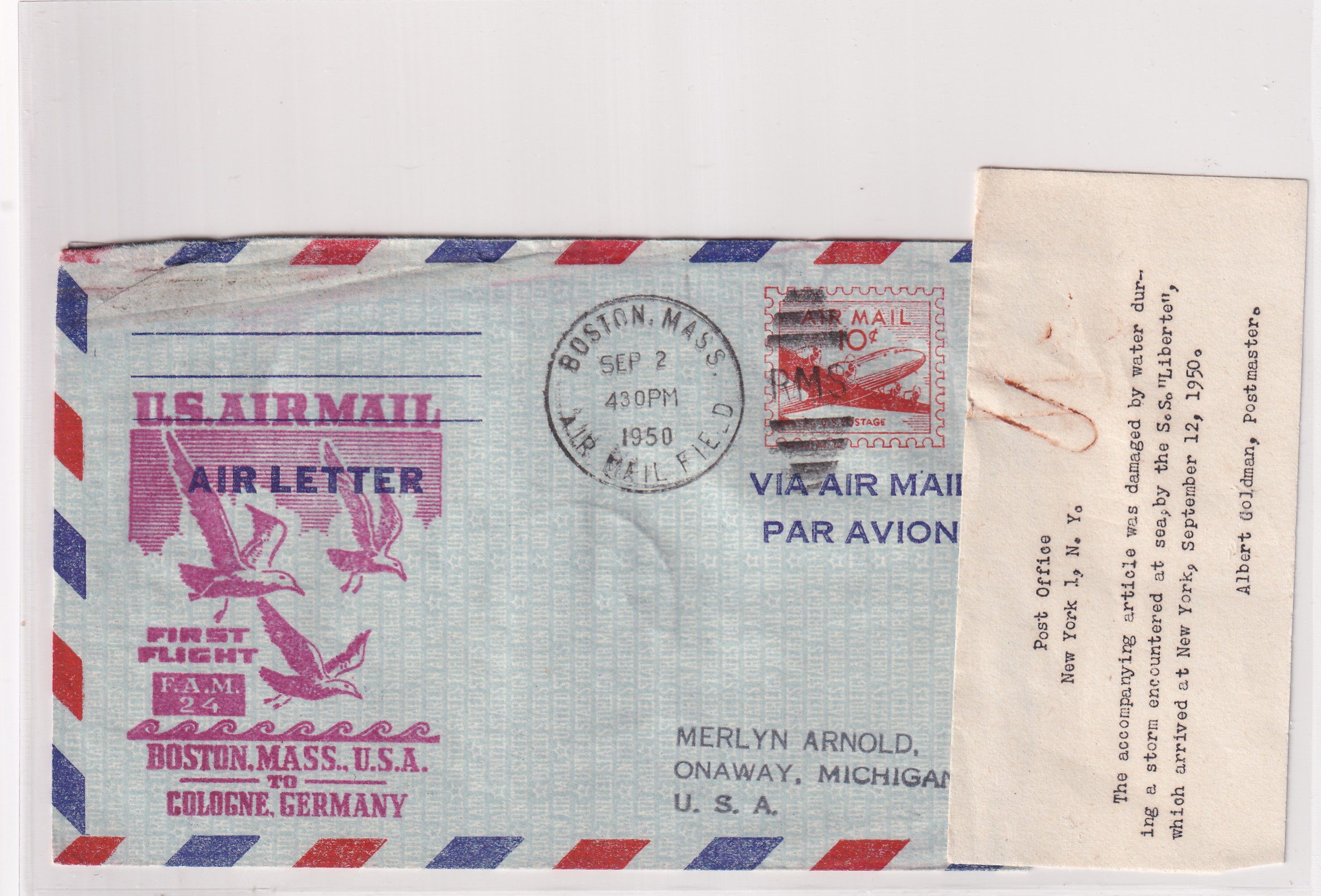 1950 1st Flight Boston, Ma to Cologne, Germany Damaged by Water During Storm onboard S.S. Liberate. back stamped Cologne.