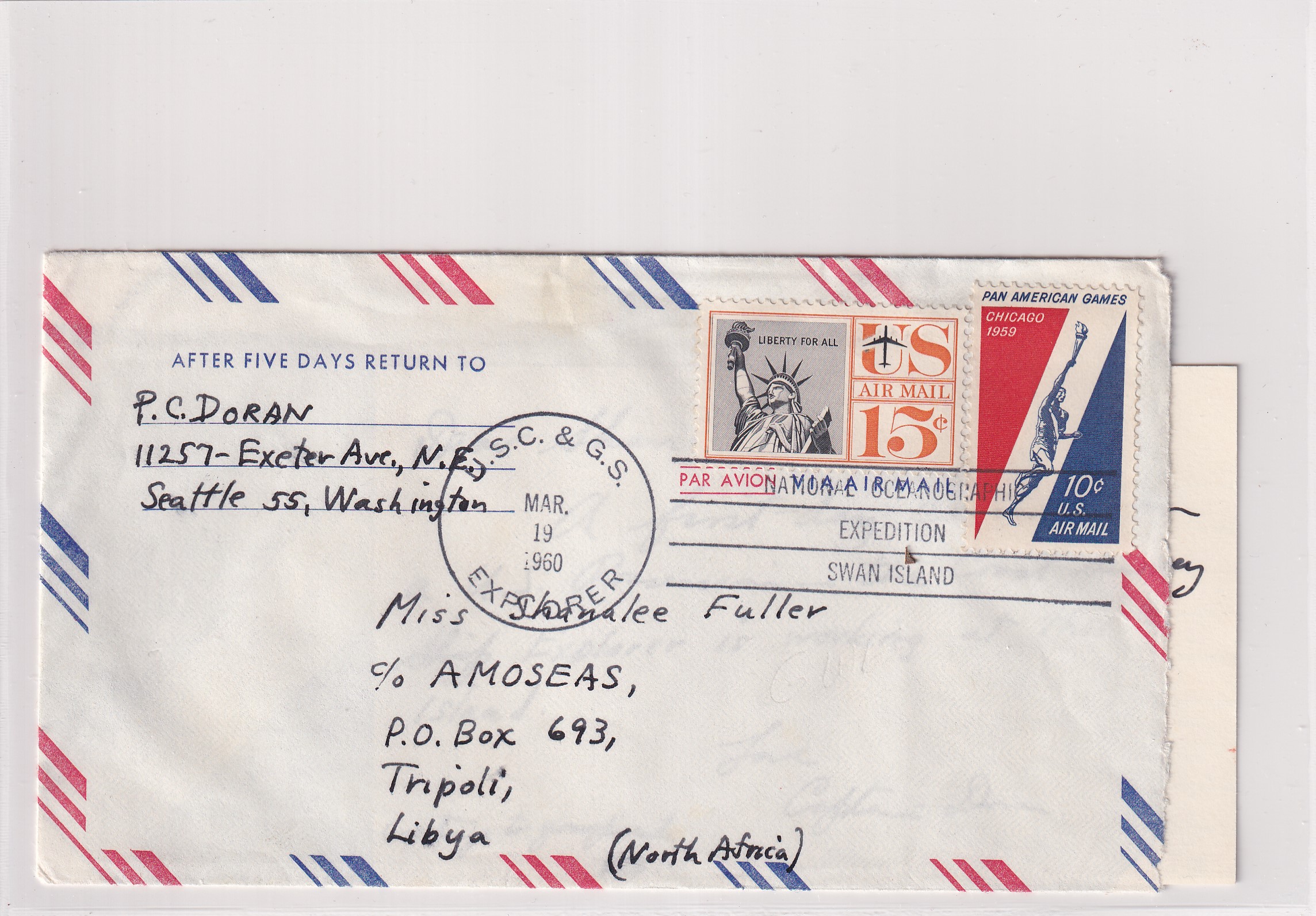 1960 Seattle, Wa to Tripoli, Libya, Swan Island Expedition Canx. back stamped U.S.C. & G.S. Explorer w/National Geographic Expedition Swan Island in the killer bars.