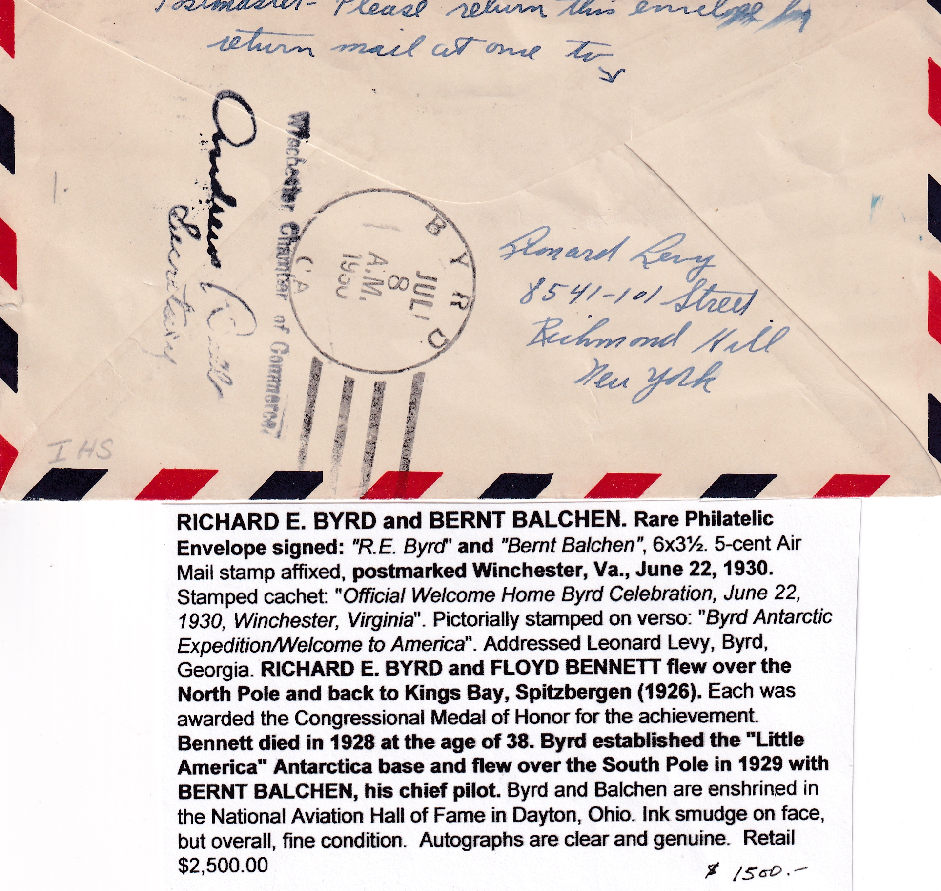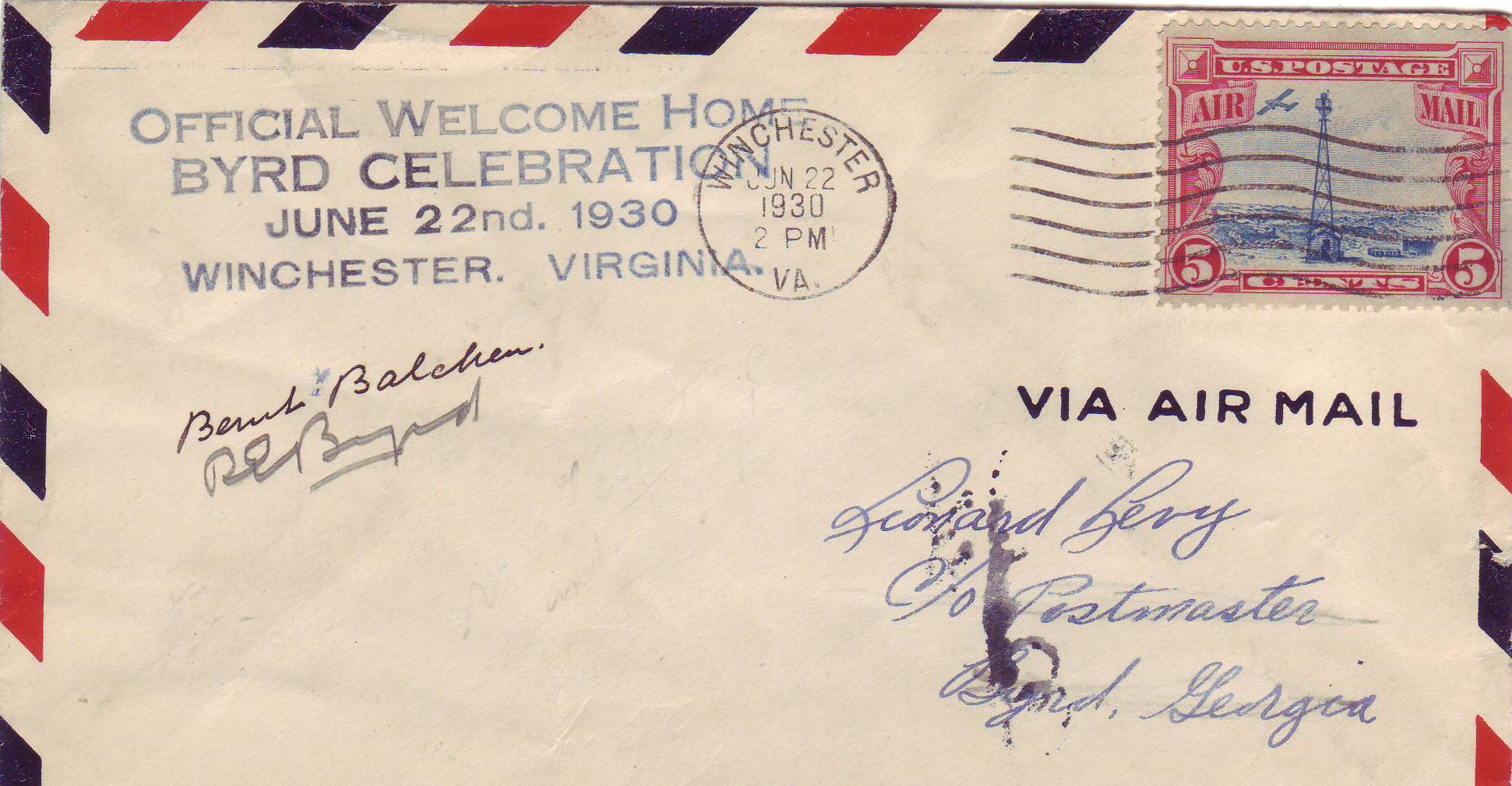 1930 Winchester, Va to Byrd, Ga Airmail signed by Adm Richard Byrd & Bernt Balchen (Rare). back stamped Byrd, Ga. Full retail on this cover is $2500.00.