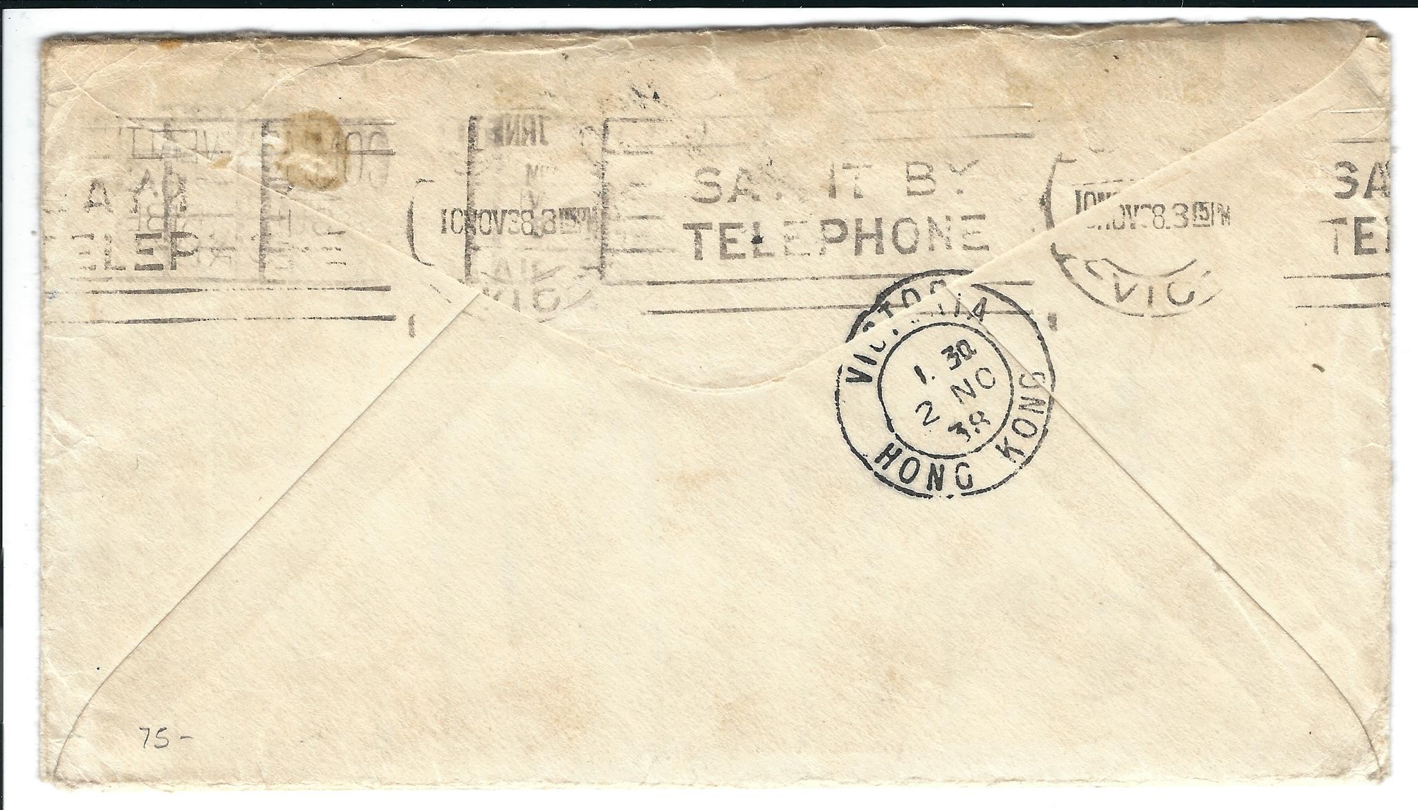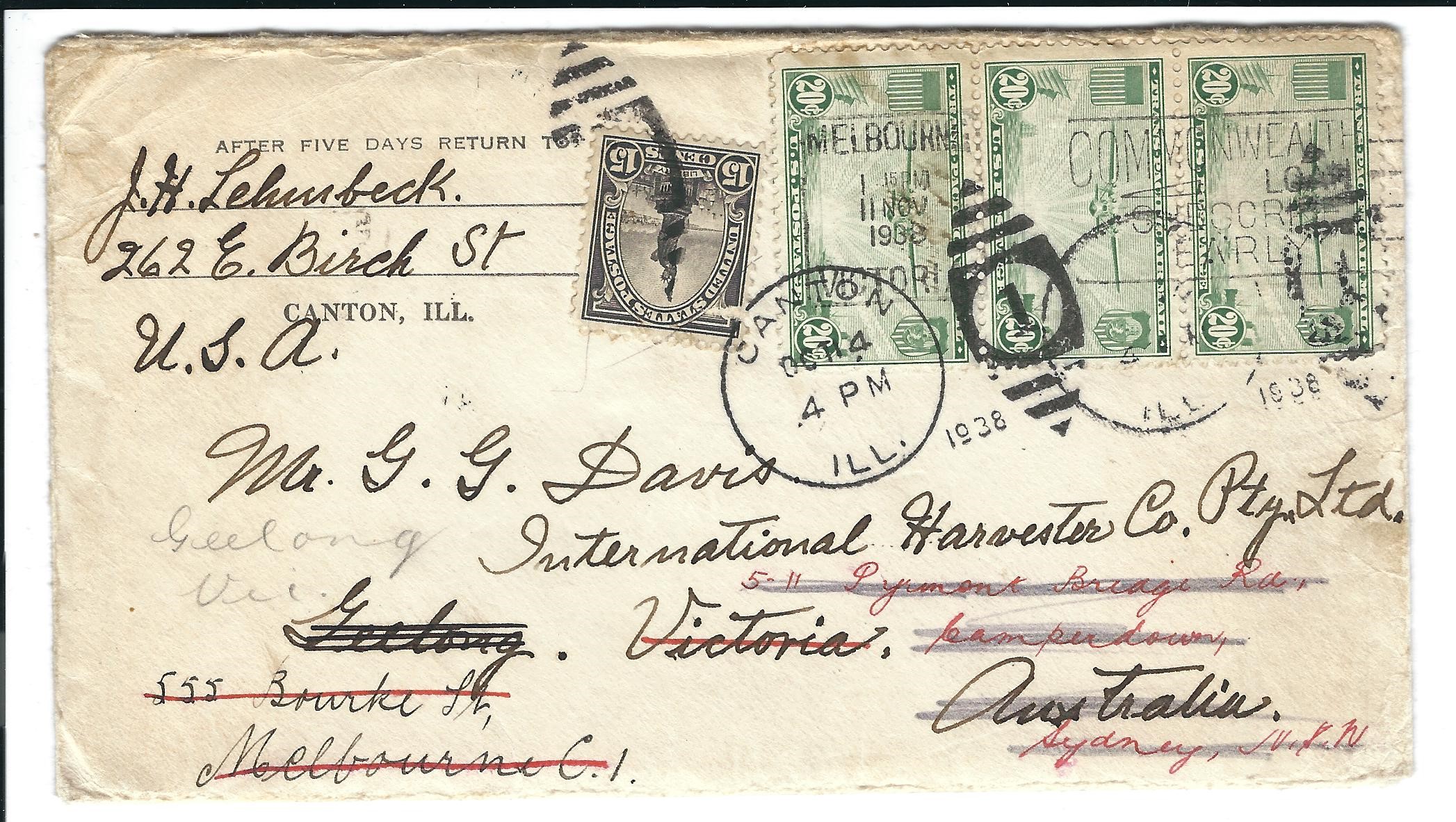 1938 Canton, IL to Victoria, Australia Trans-Pacific Clipper Airmail via Hong Kong, fwv Sydney, fwd Melborne. back stamped Hong Kong & Victoria. Letter enclosed.
