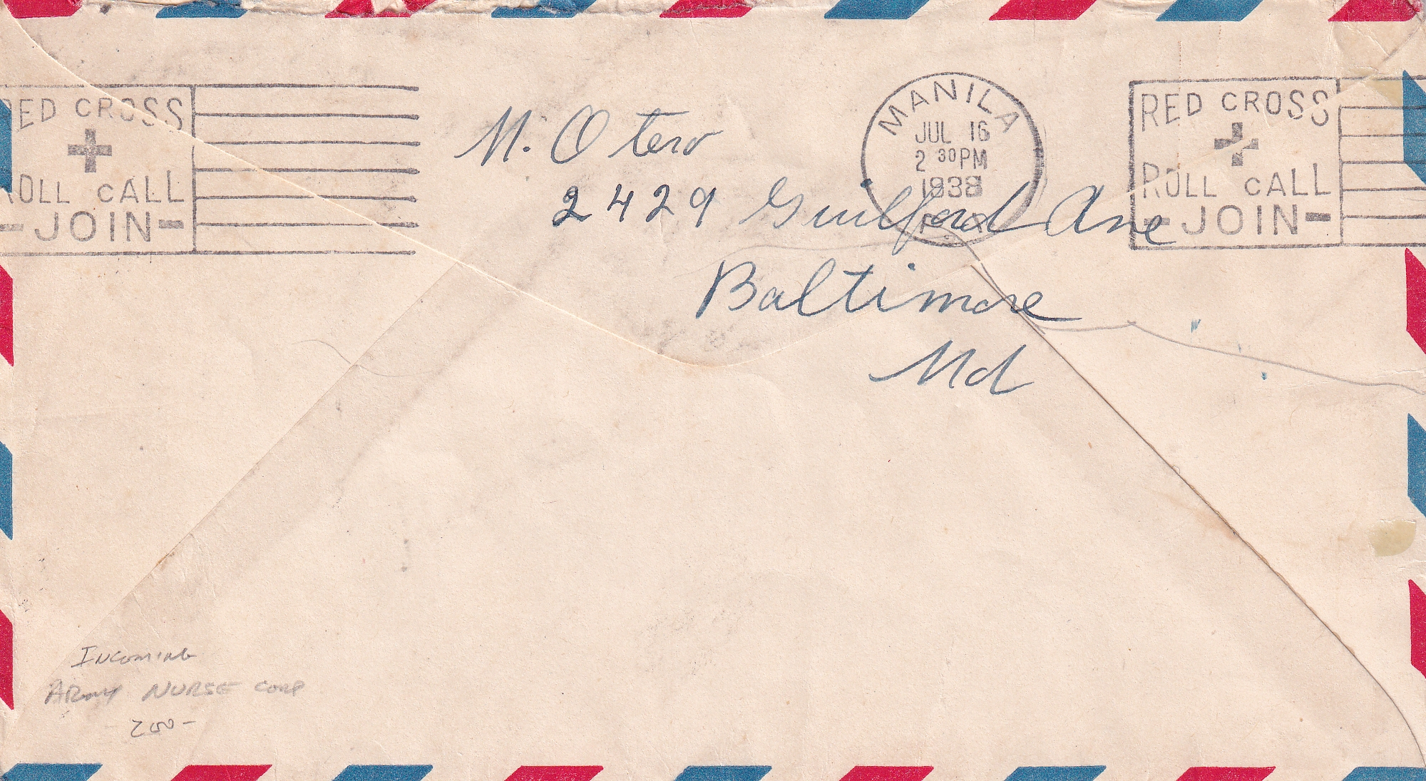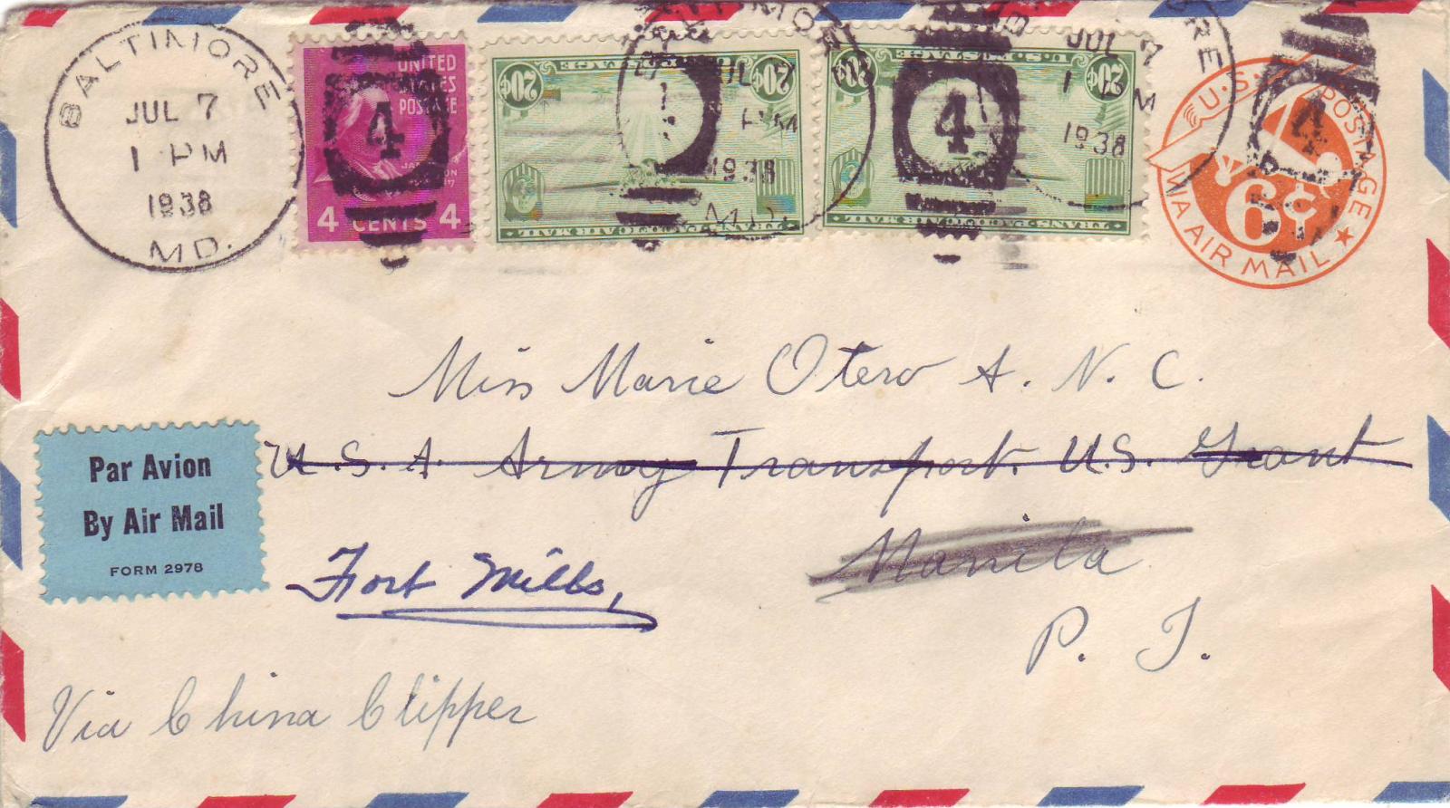 1938 Baltimore, MD to U.S. Army Nurse, Fort Mills, Philippines Trans-Pacific Clipper Airmail. back stamped Manila. Mail to/fm Army Nurse Corp in the Philippines is very scarce due to the small numbers stationed at Fort Mills.
