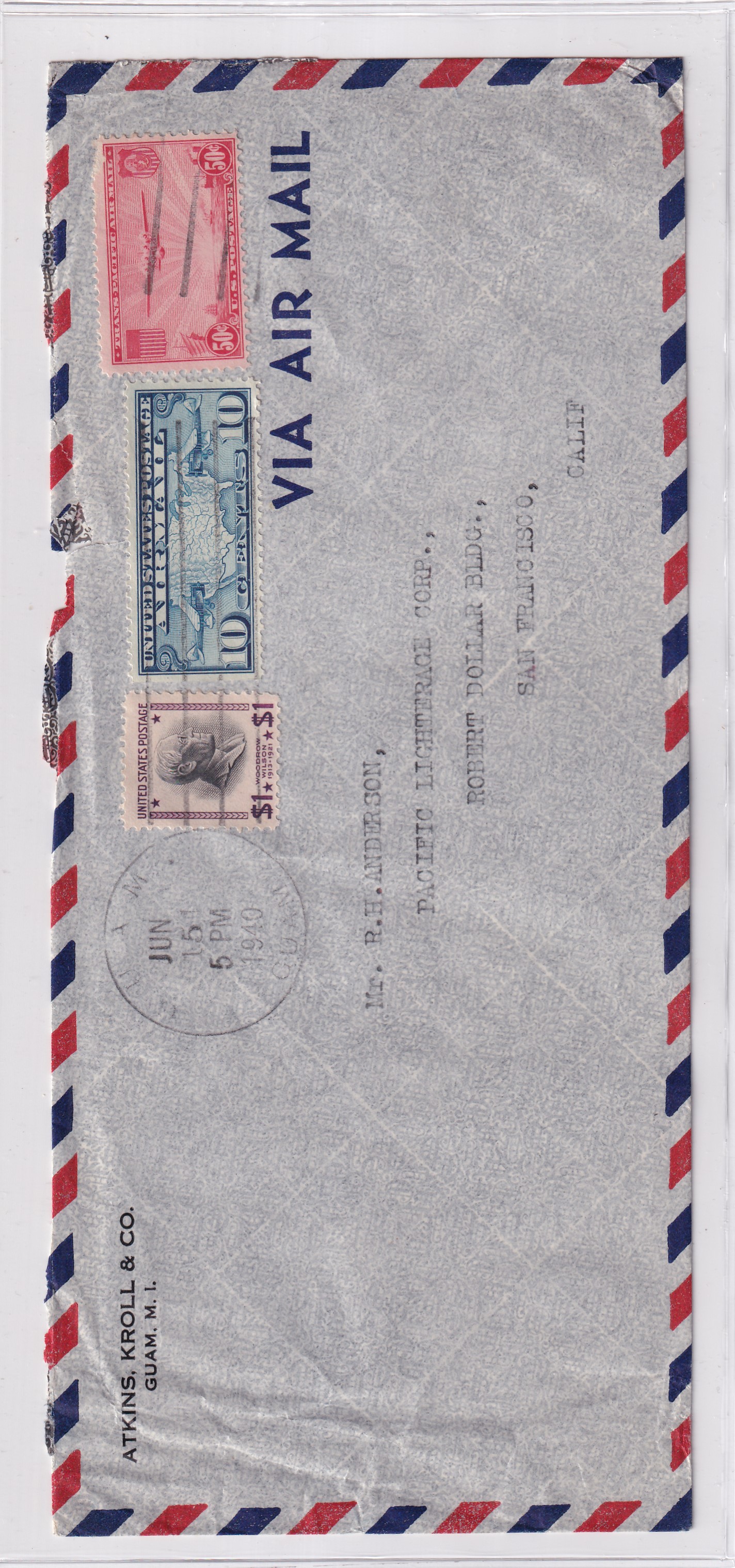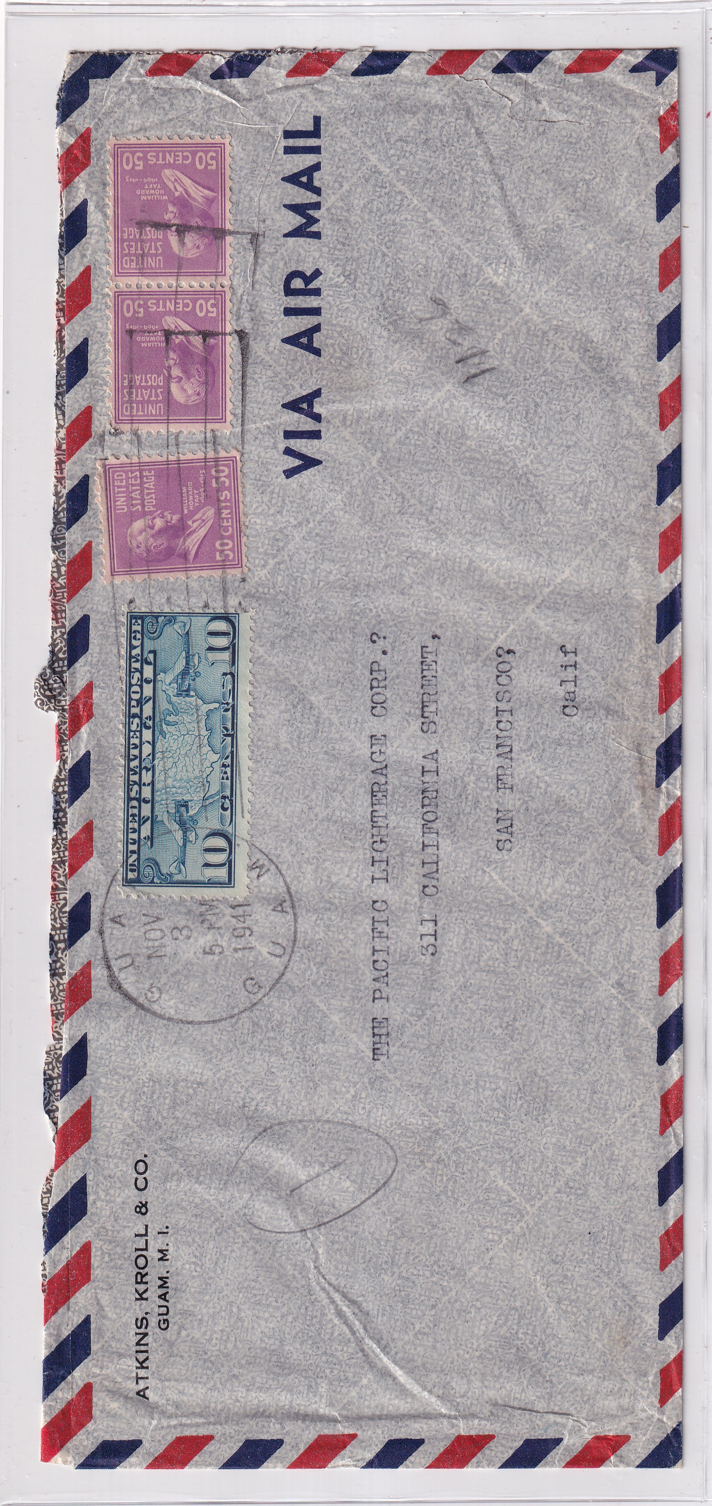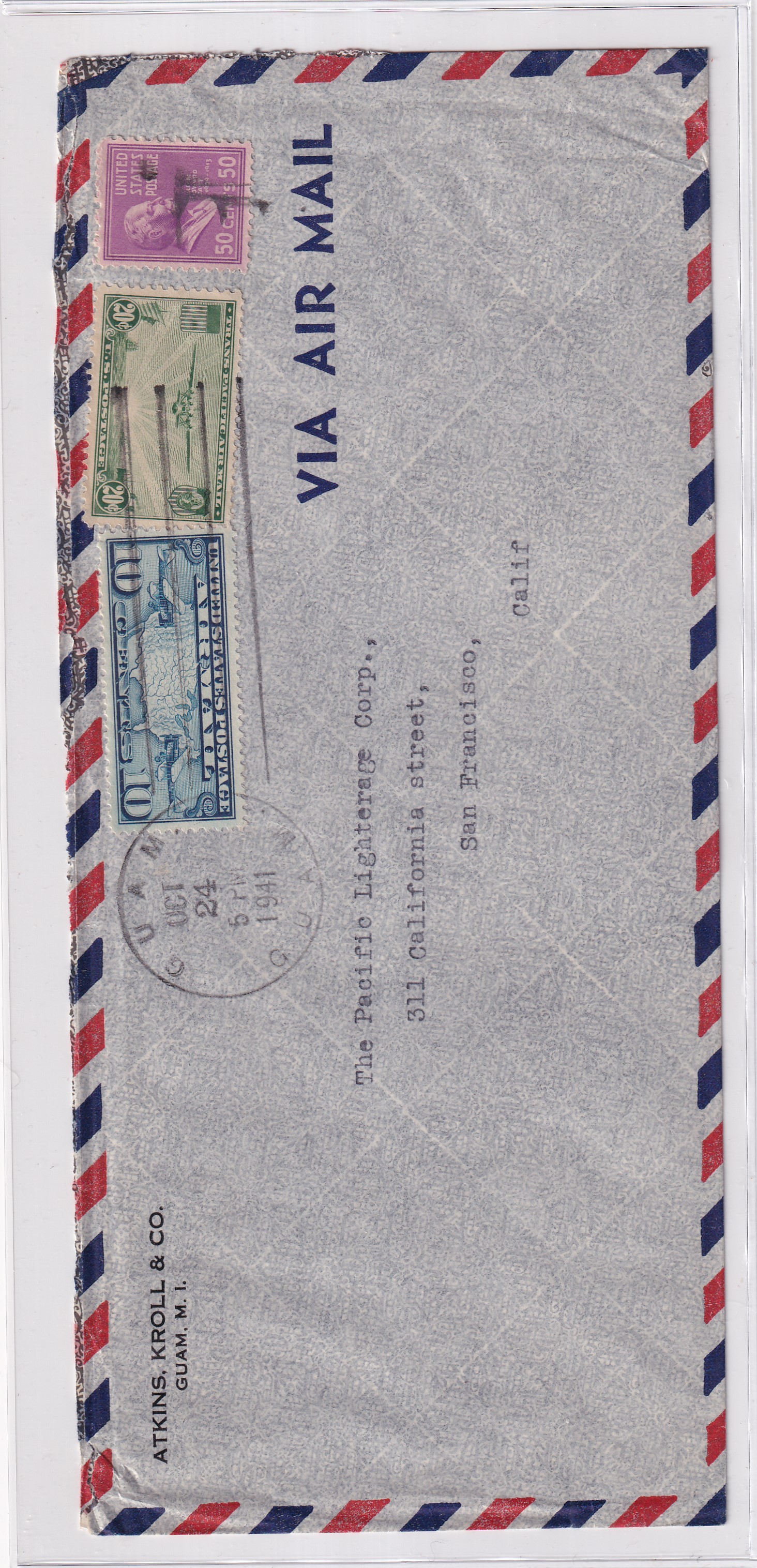 1941 Guam, M.I. to San Francisco, Ca Clipper Airmail 10c Bi-Plane/Map, & 50c Prexie x 3. 8 times rate.