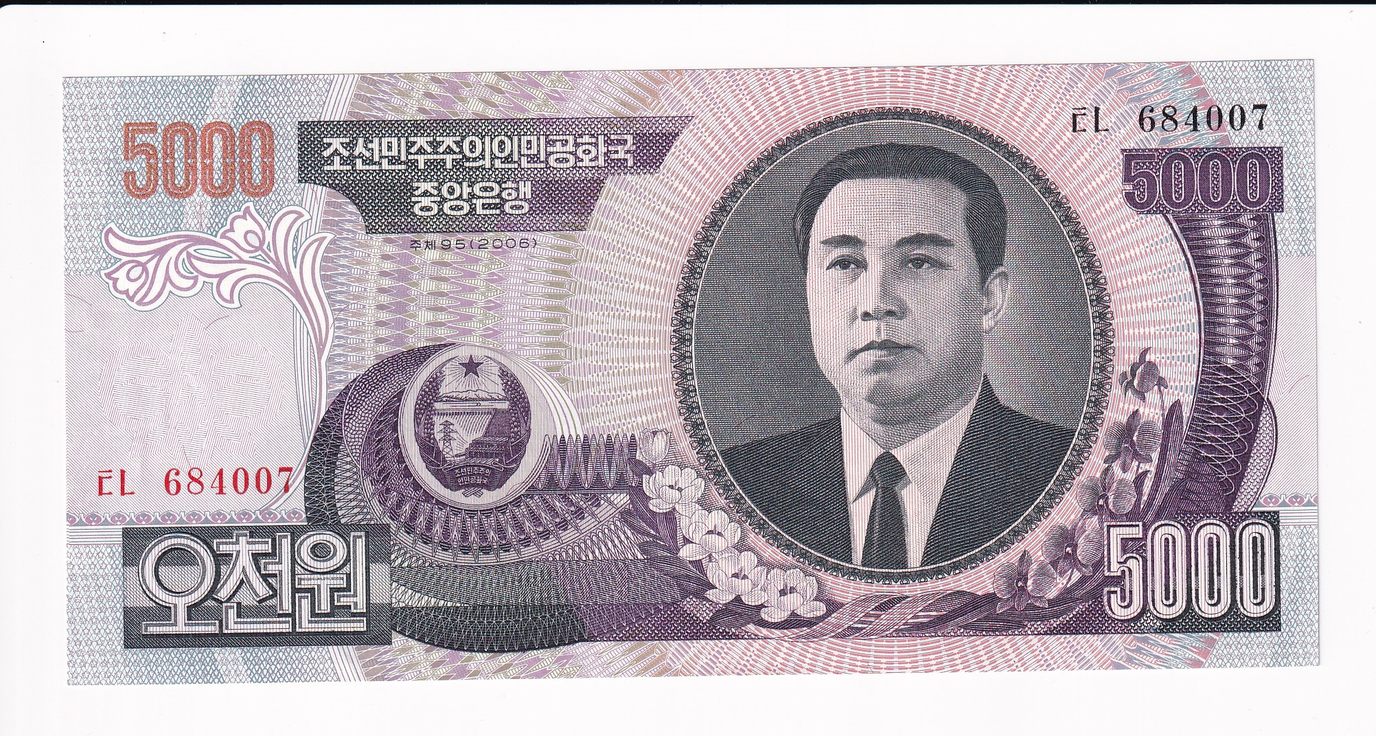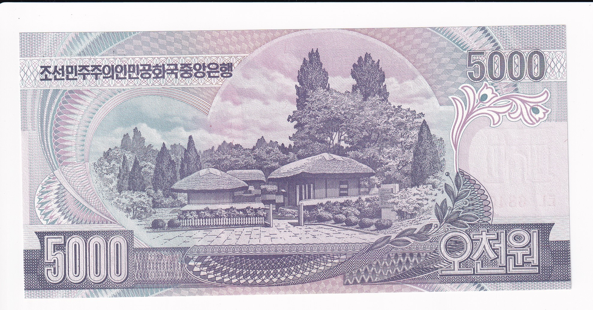 | North Korea: 5000 Won Banknote, KR #46c, UNC. Added Thursday, December 25, 2025 | Price: $30.00