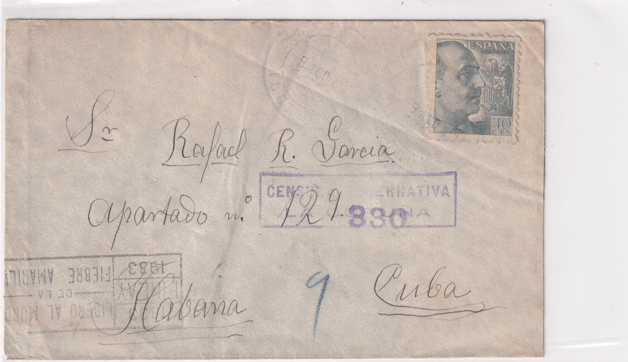 | 1933 Guernativa, Spain to Havana, Cuba Censored. Added Friday, March 20, 2026 | Price: $20.00