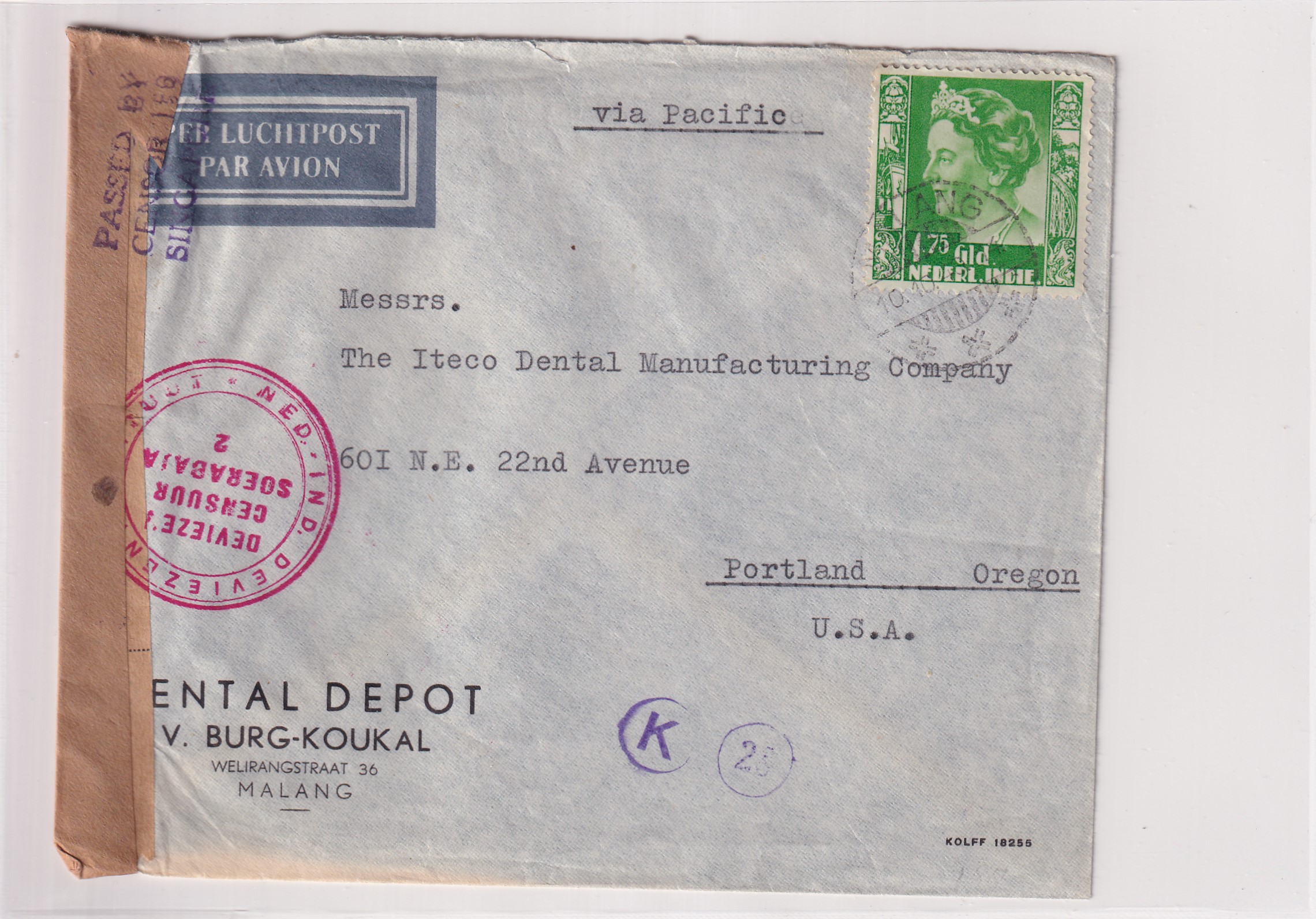 1940 Maland, Netherlands East Indies to Portland, Or via Pacific Clipper. D.E.I. & Singapore Censors. Added Wednesday, February 18, 2026