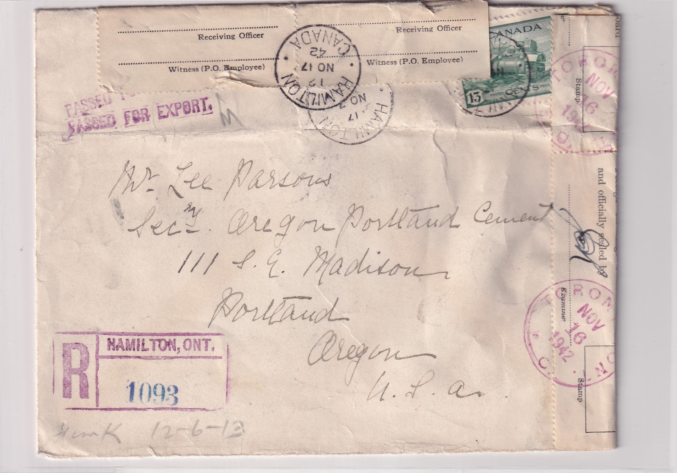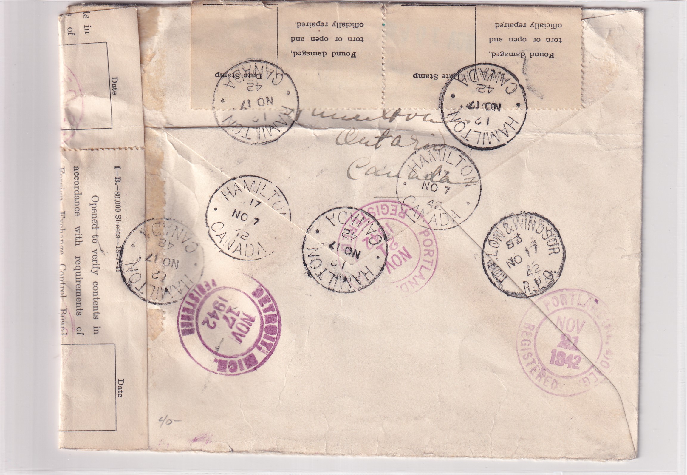 1942 Hamilton, Canada to Portland, Or Registered, Censored. back stamped Hamilton, Low & Windsor RPO, Detroit, Portland. Added Wednesday, February 18, 2026