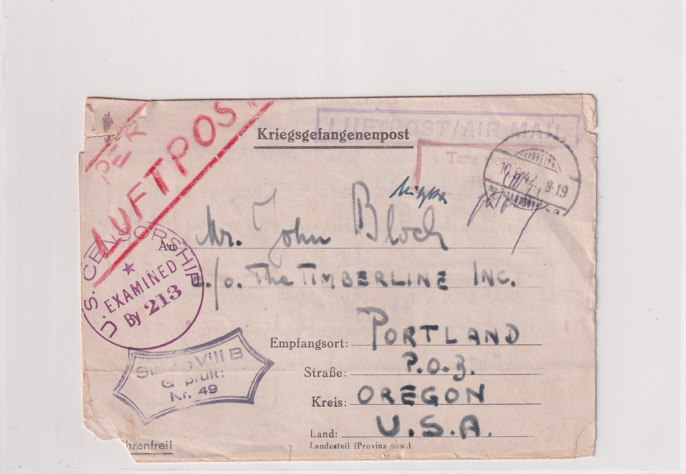 | 1942 U.S. Pow in Stalag VIIIB to Portland, Or, German & US Censors. Added Tuesday, March 17, 2026 | Price: $25.00