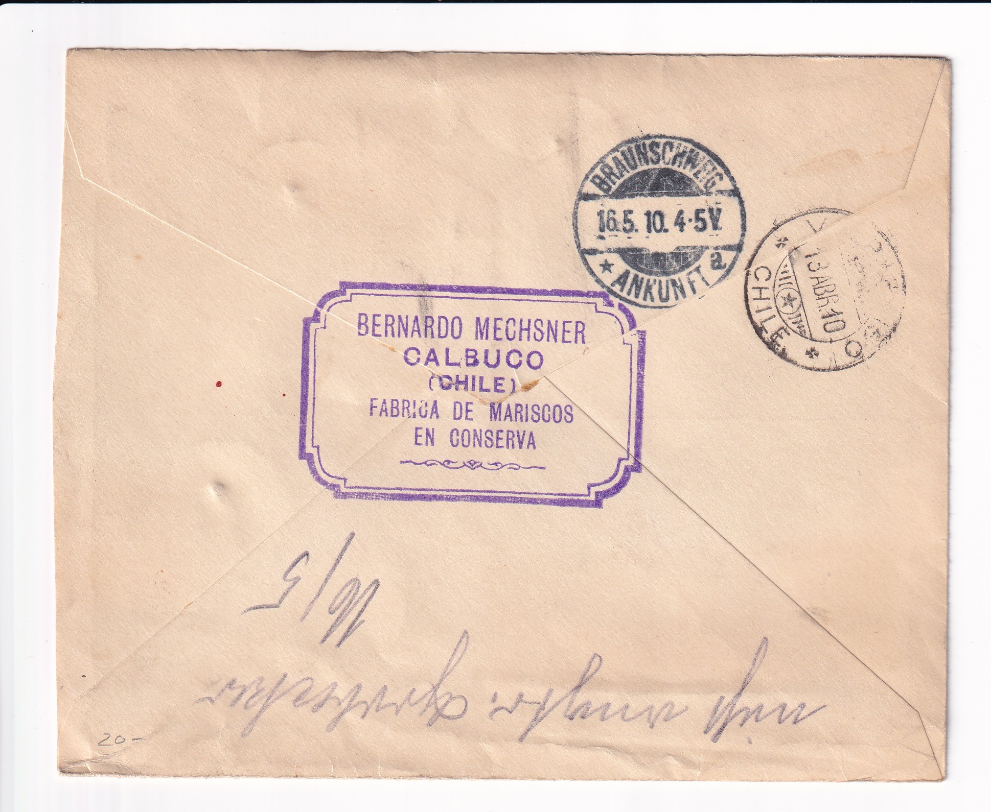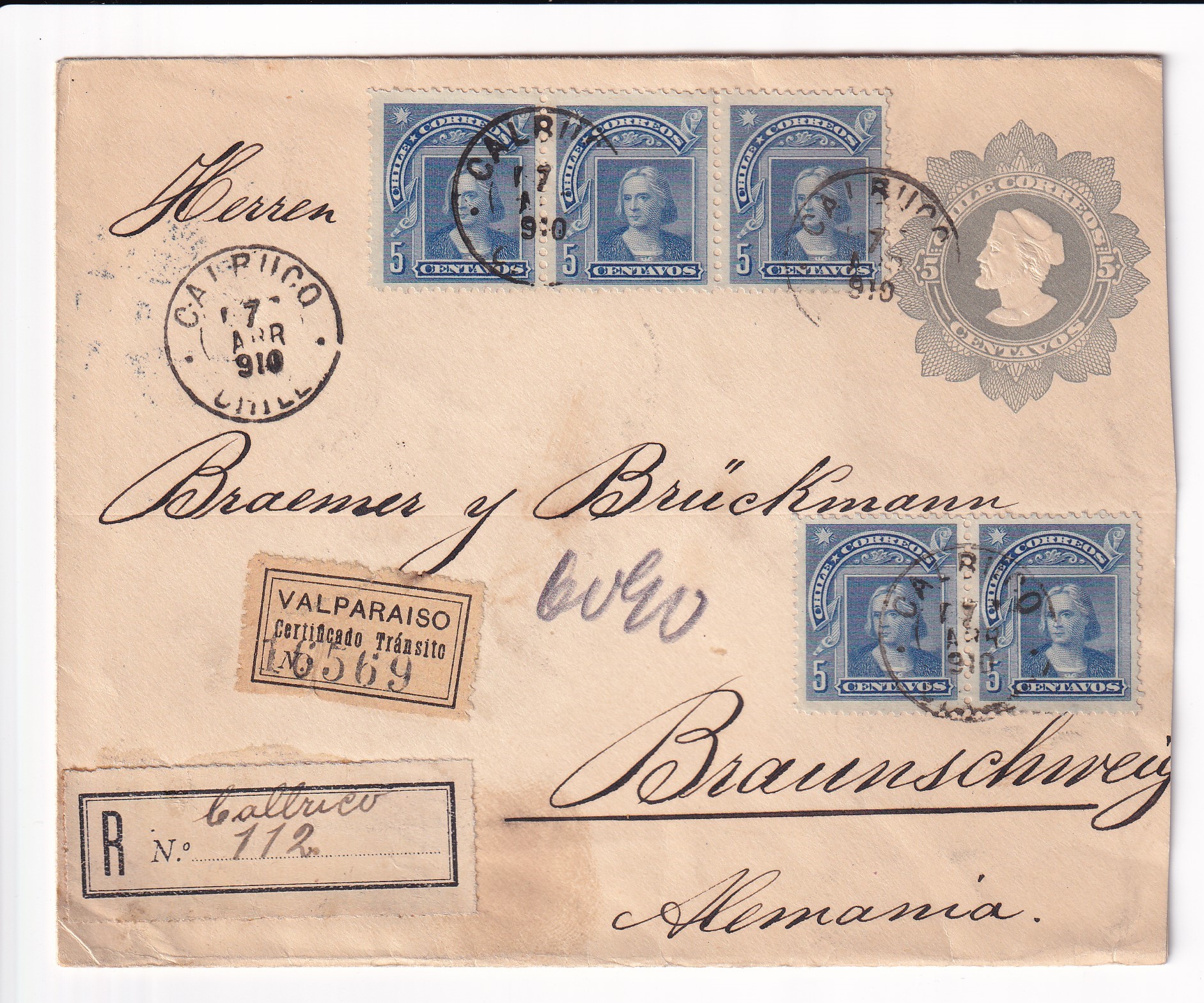 | 1910 Calbuco, Chile to Braunschweig, Germany Registered. back stamped Valparaiso & Braunschweig. Added Tuesday, March 17, 2026 | Price: $20.00