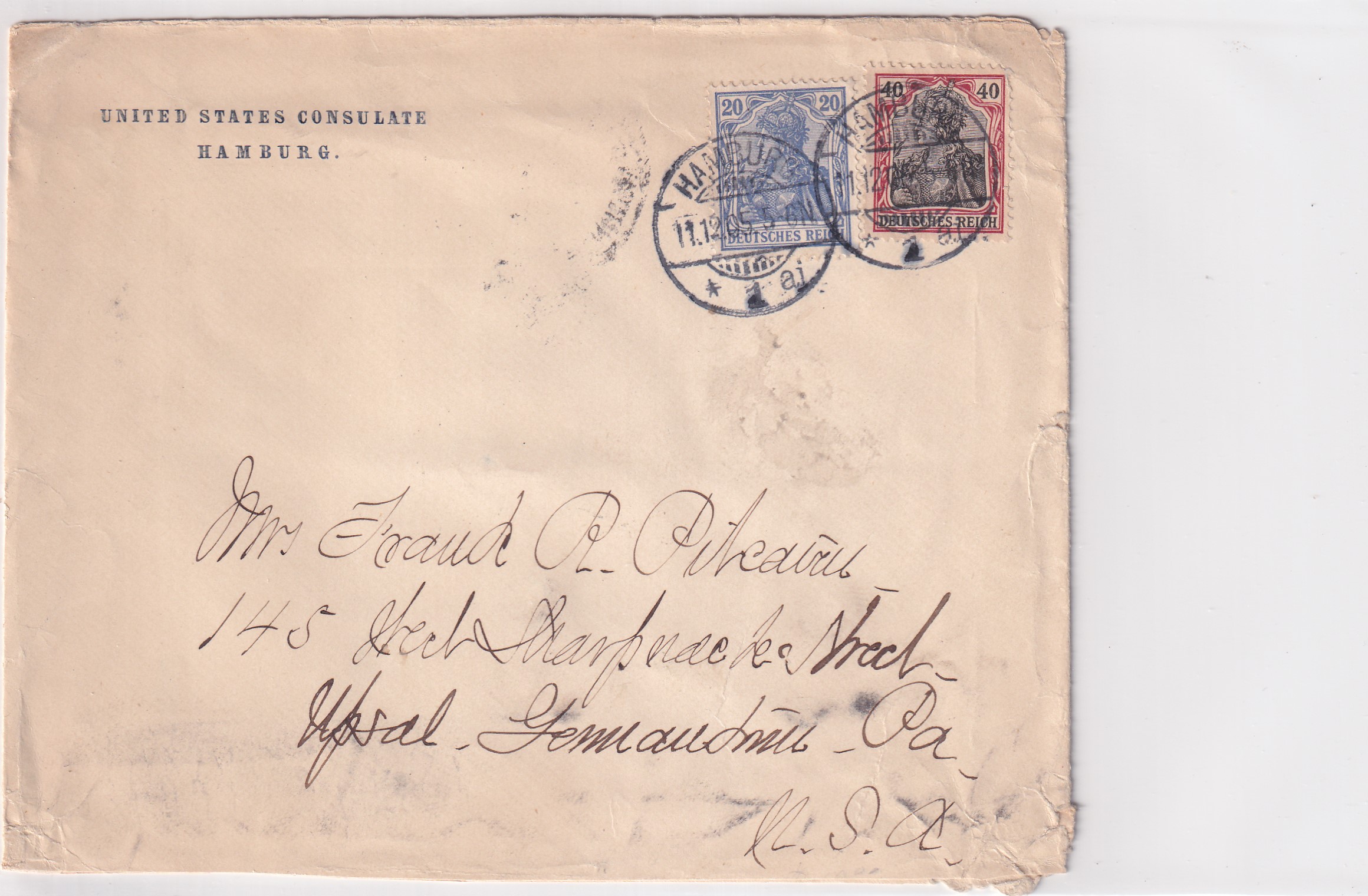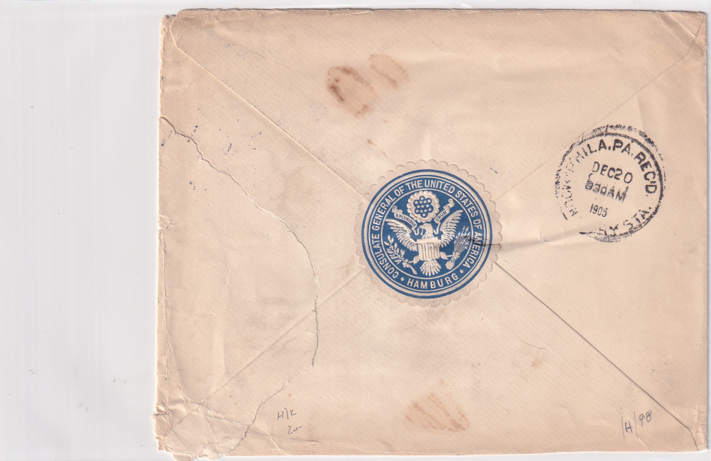 | 1905 U.S. Embassy Hamburg, Germany to Germantown, Pa. back stamp Philadelphia. Added Tuesday, March 17, 2026 | Price: $15.00