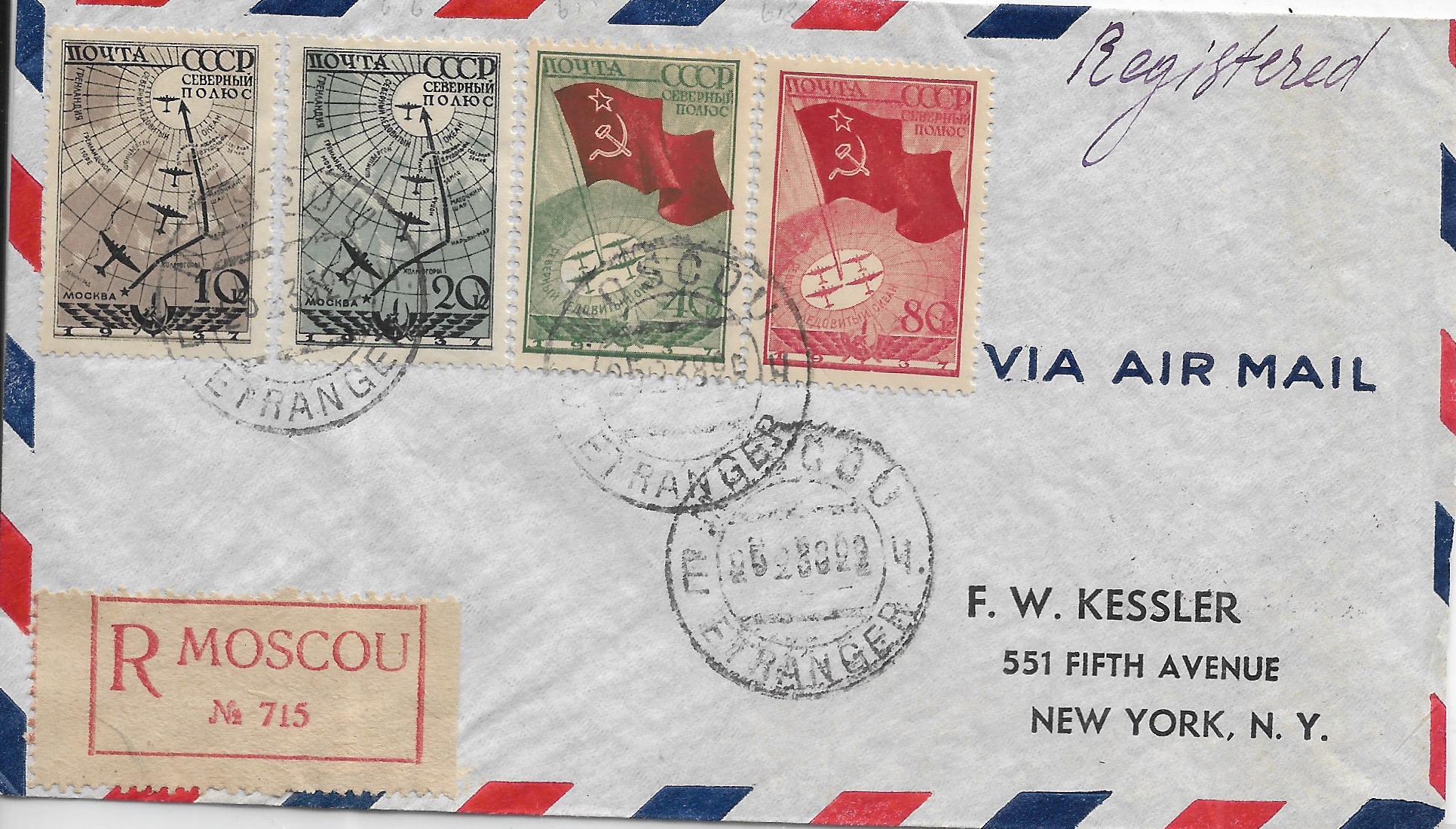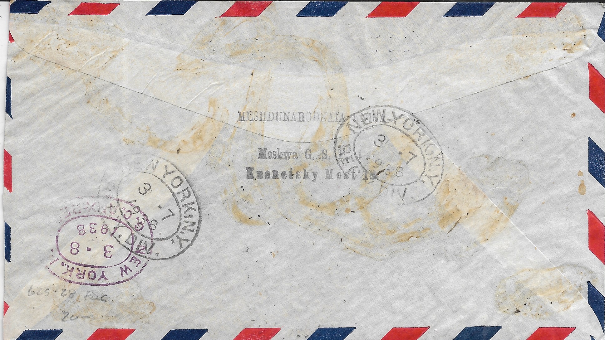 1938 Moscow, Russia to New York, NY Registered Airmail FDC, Sc #625-628. back stamped New York. Added Saturday, November 8, 2025