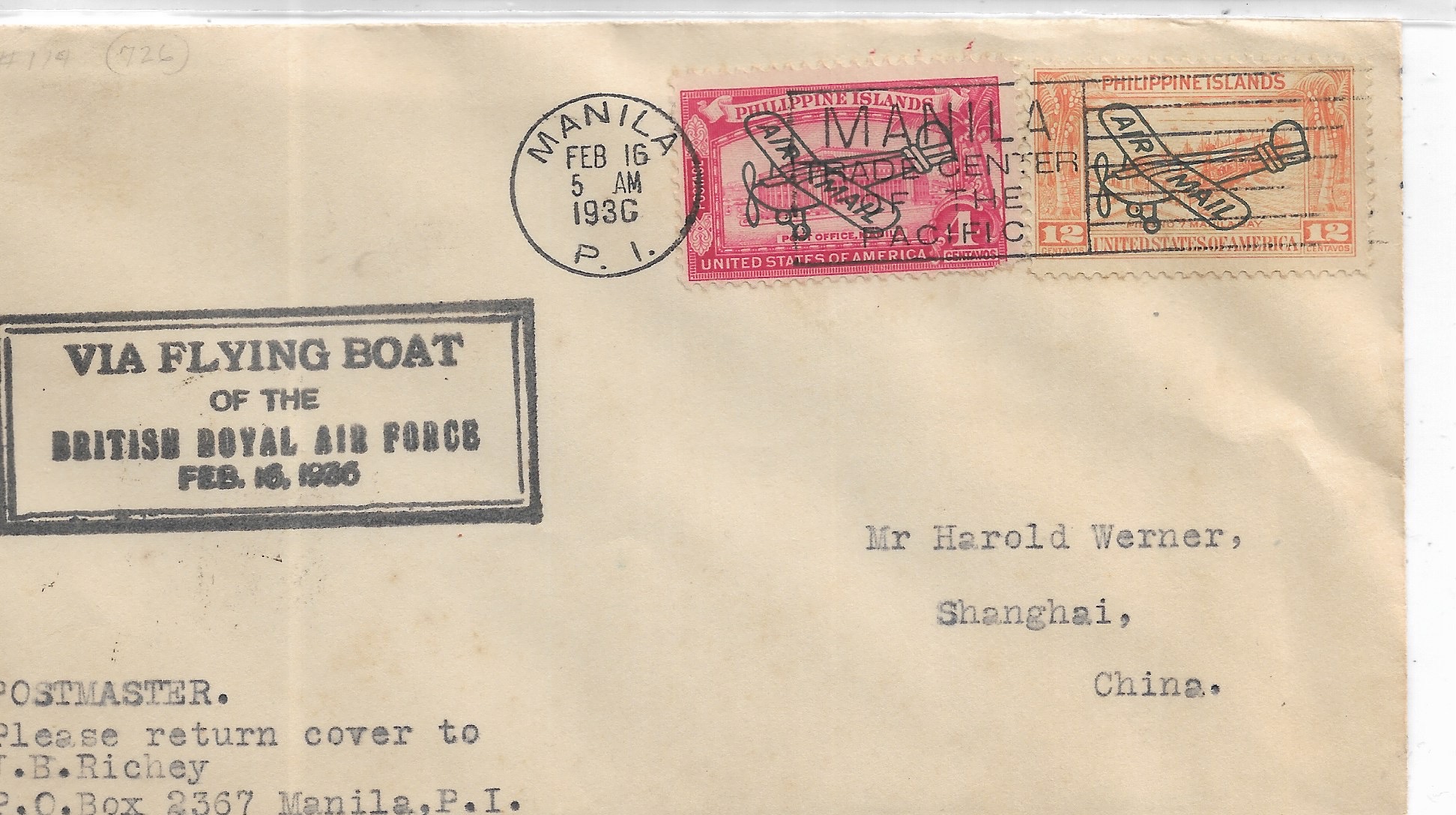 1936 Manila, Philippines to Shanaghai, China via Royal British Flying Boat. back stamped Shanghai. Added Saturday, November 8, 2025