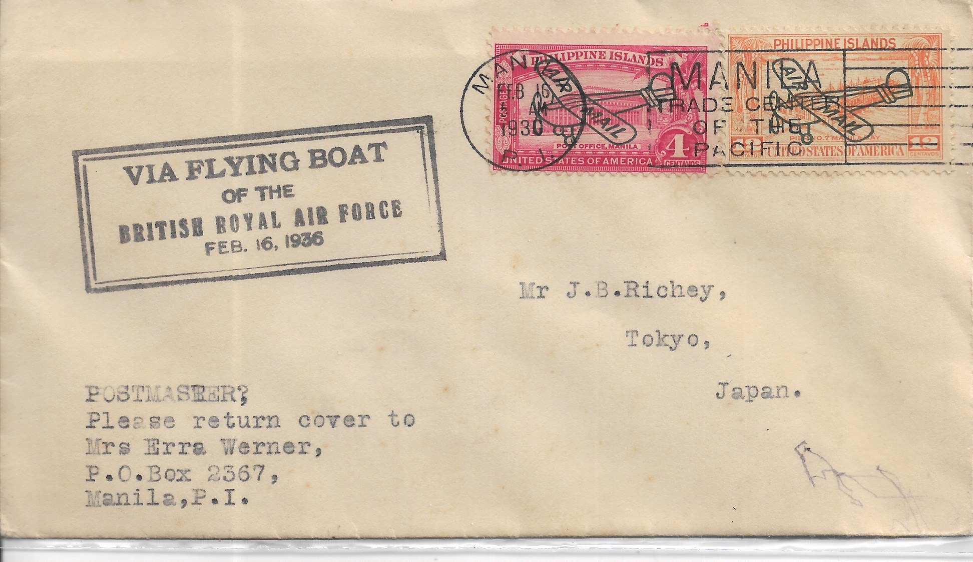 1936 Manila, Philippines to Tokyo, Japan via Royal British Flying Boat. back stamped Tokyo. Added Saturday, November 8, 2025