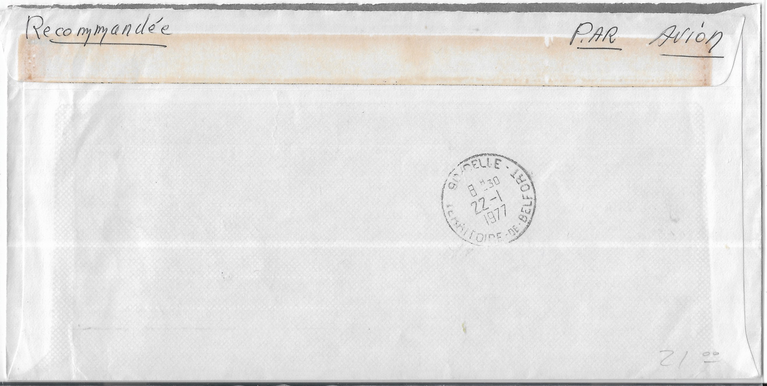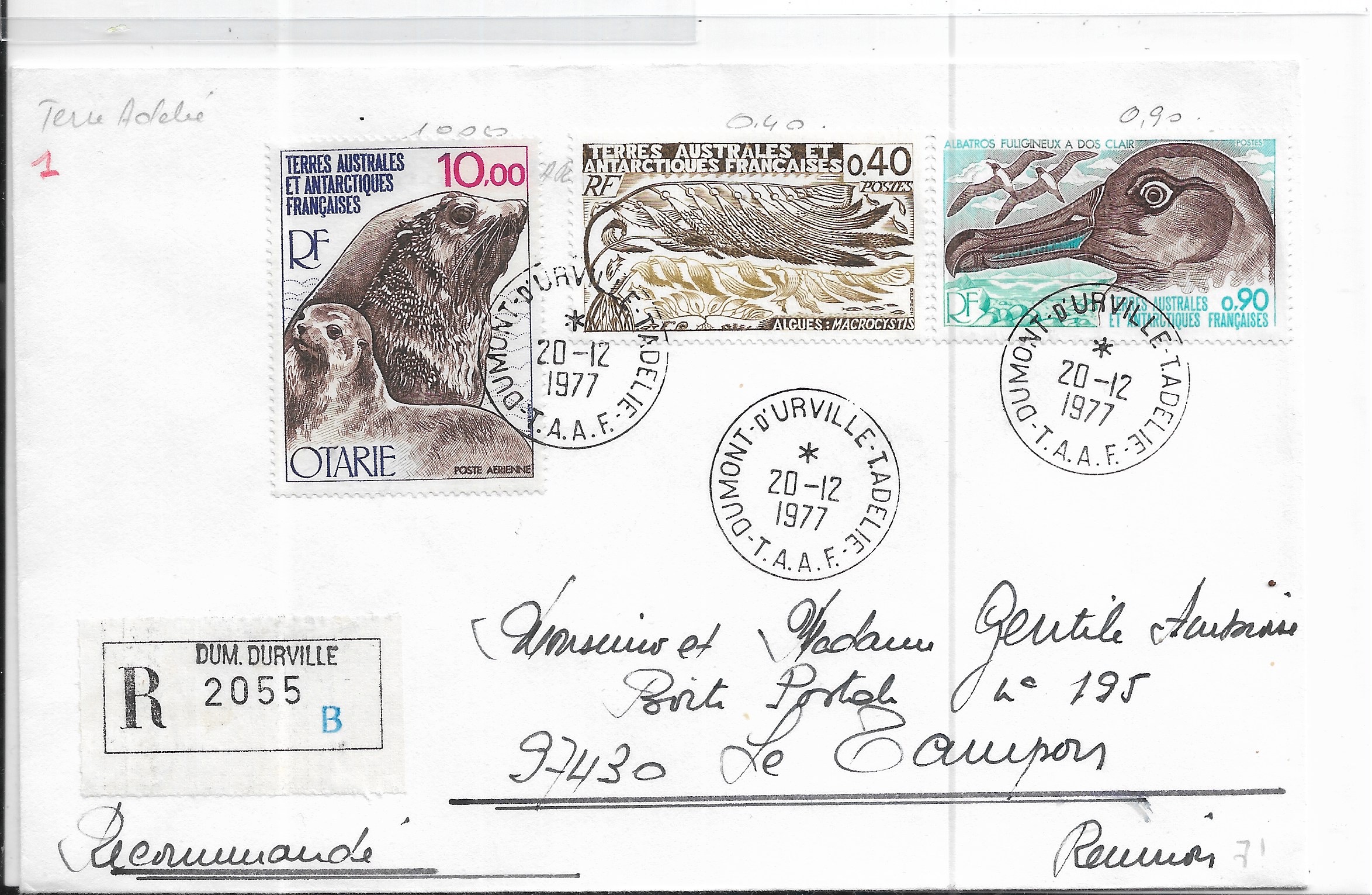1977 Dumont-d'Urville, Tadelie, French Southern & Antarctic Territory to Reunion Registered. back stamped Reunion. Added Sunday, November 9, 2025