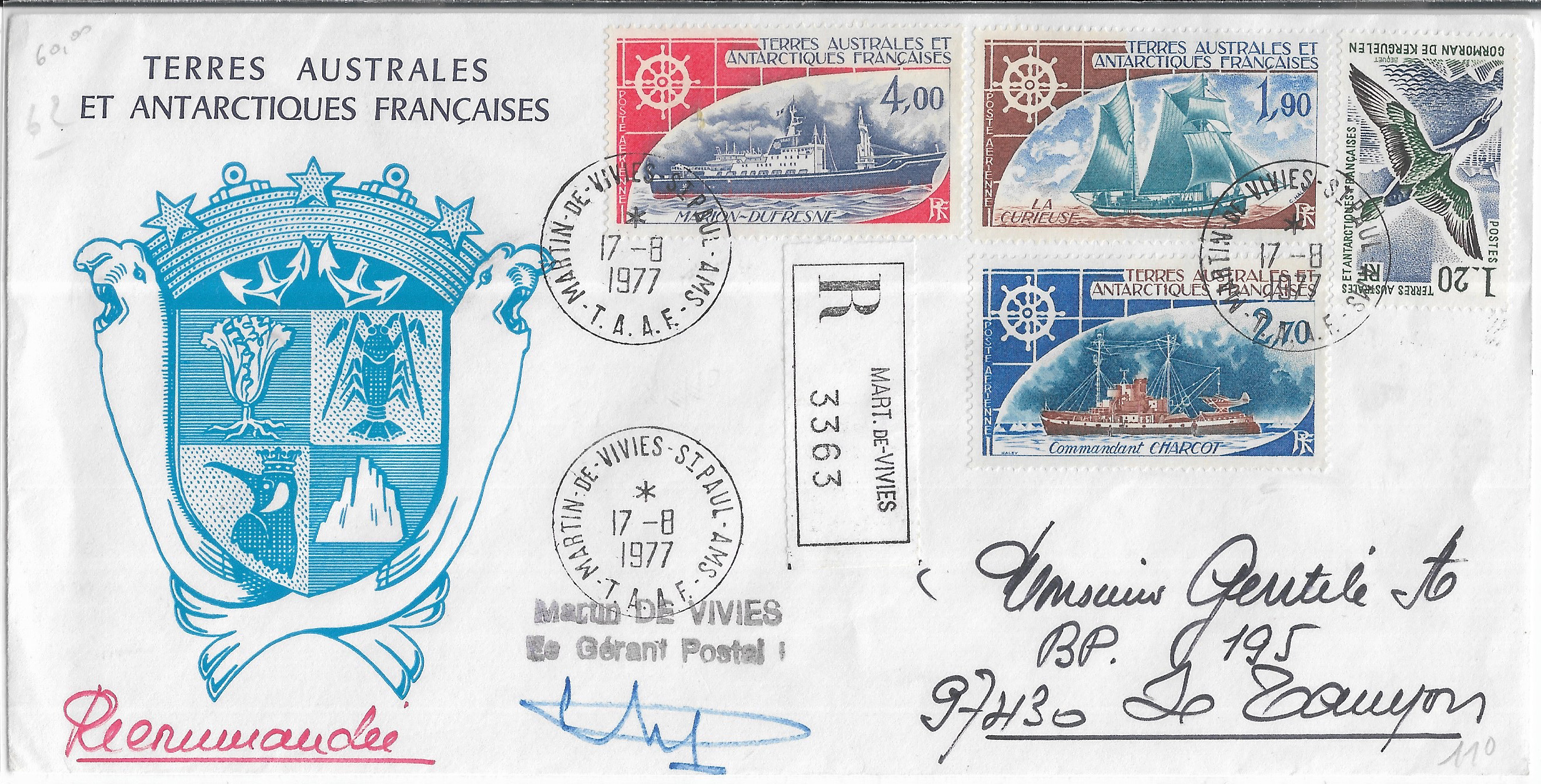 1977 Martin de Vivies, St Paul, French Southern & Antarctic Territory to Reunion Registered. back stamped Reunion. Added Sunday, November 9, 2025