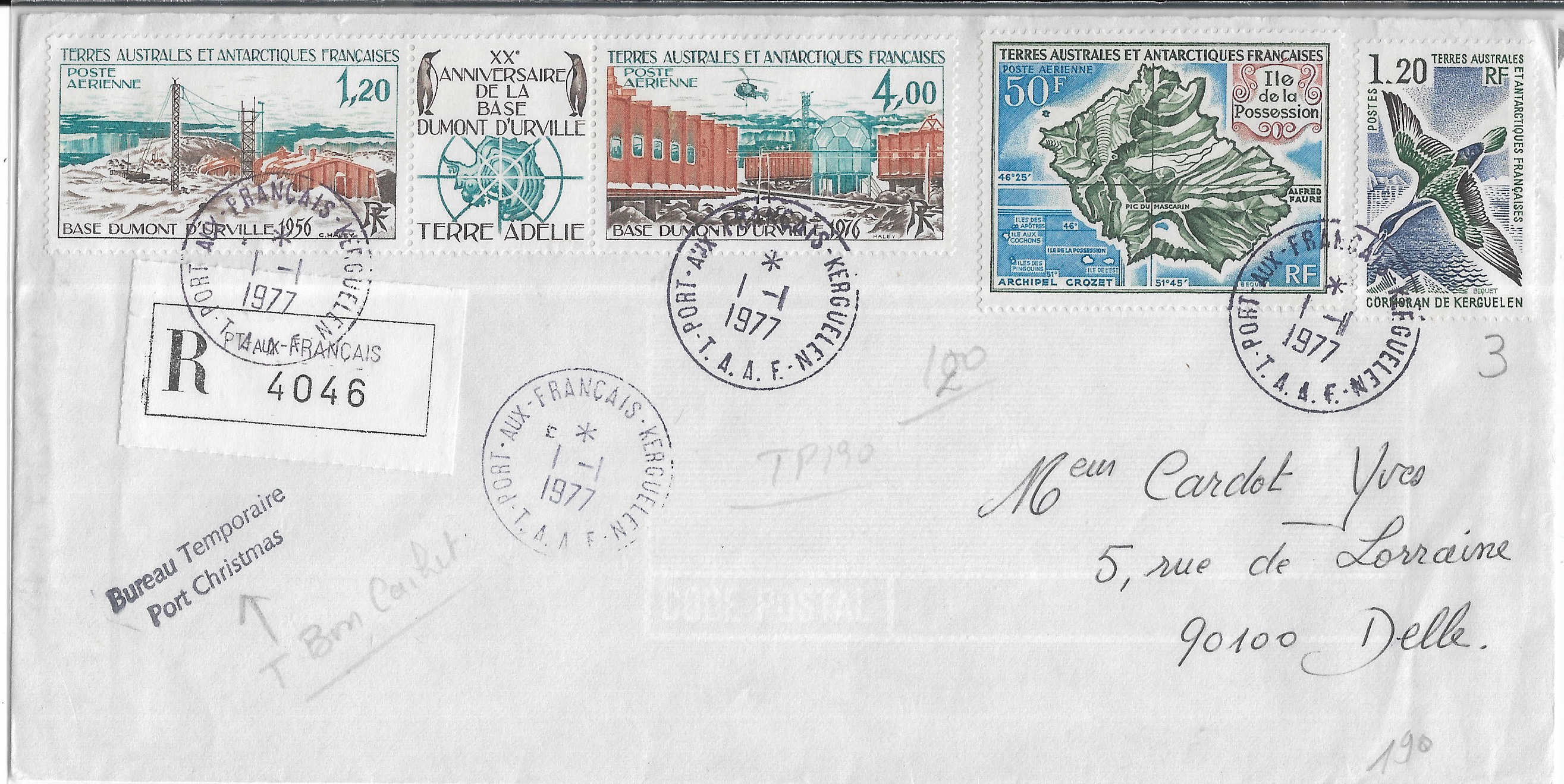 1977 Port-Aux-Francais, Kerguelen, French Southern & Antarctic Territory to France Registered. back stamped. Added Sunday, November 9, 2025