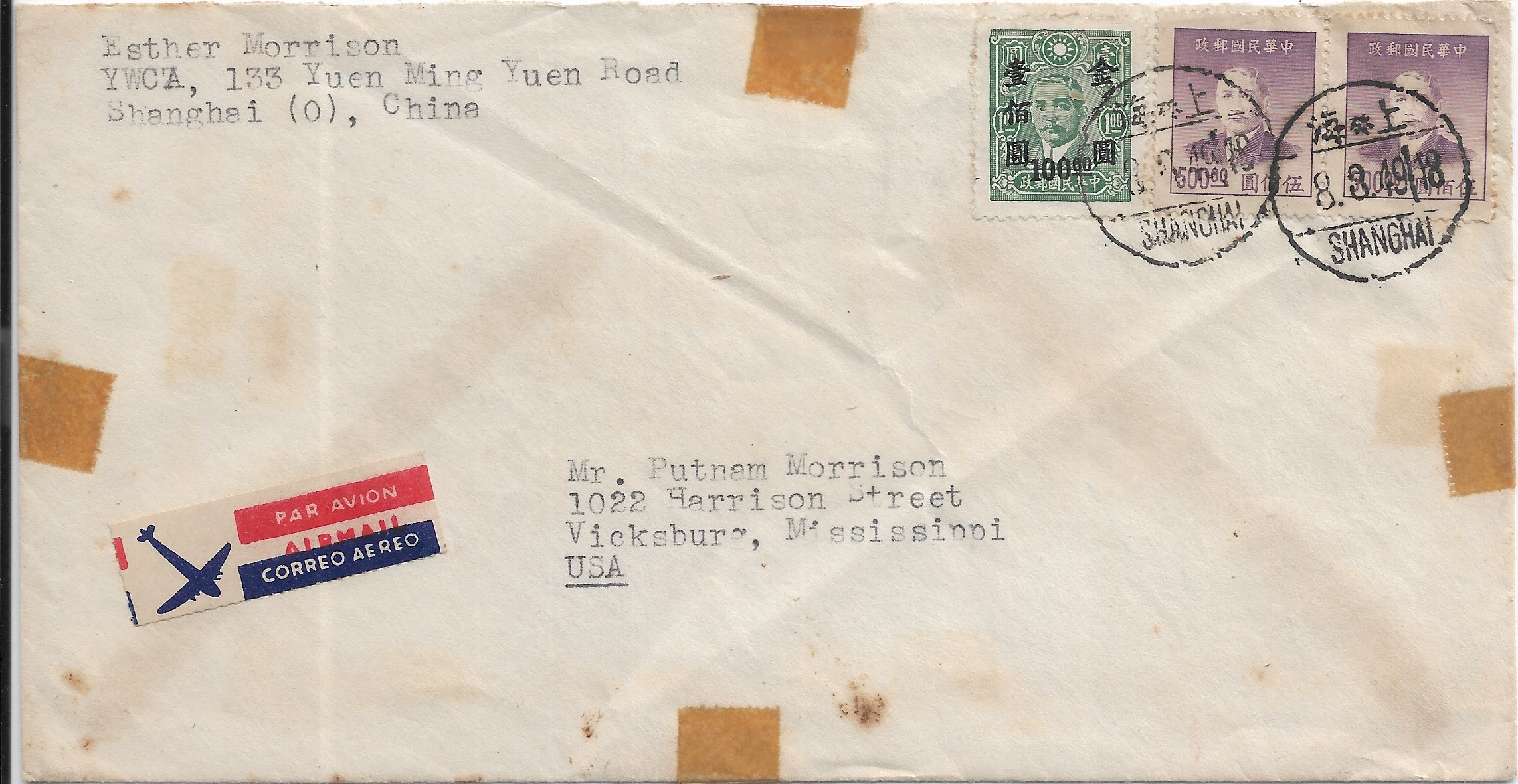 1949 Shanghai, China to Vicksburg, MS Airmail. Missing back flap. Added Monday, November 10, 2025