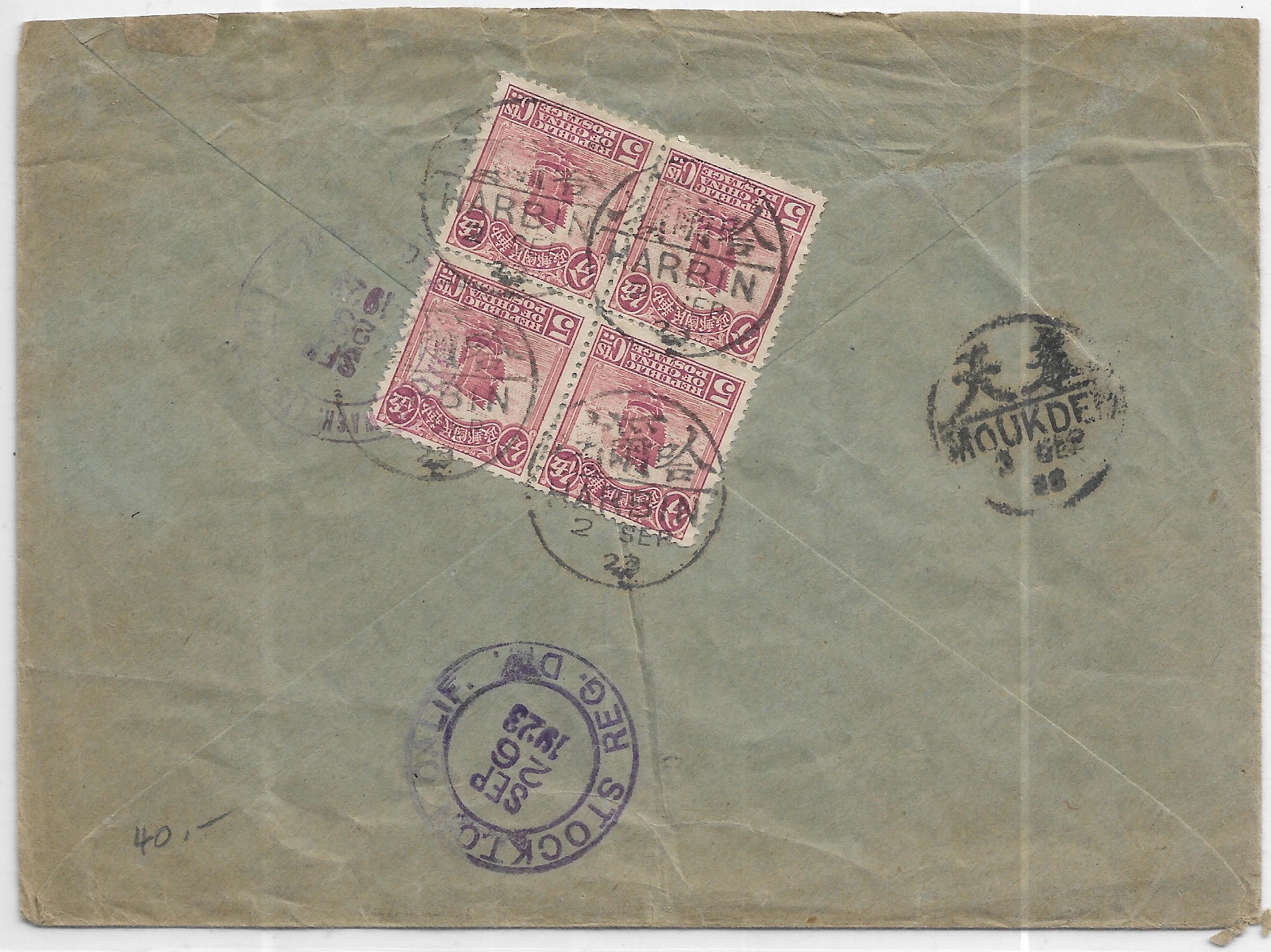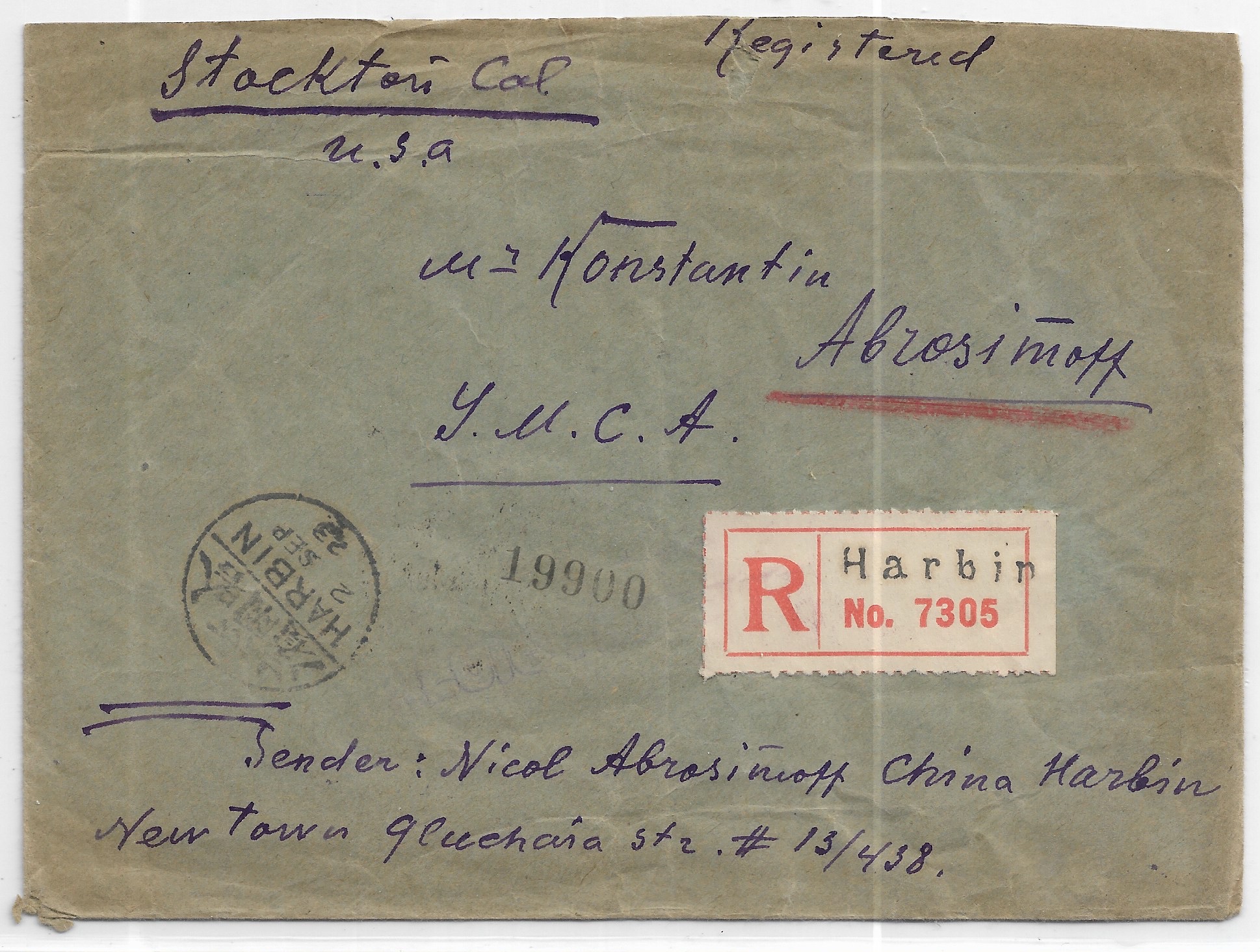 1923 Harbin, China to Stockton, Ca Registered. back stamped Moukden & Stockton. Added Saturday, November 8, 2025
