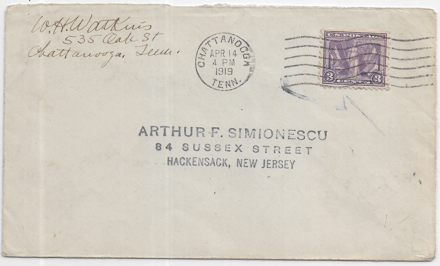 1919 Chattanooga, TN to Hackensack, NJ solo use Sc #537 (3c Victory). tough stamp to find used correctly. Added Sunday, November 16, 2025