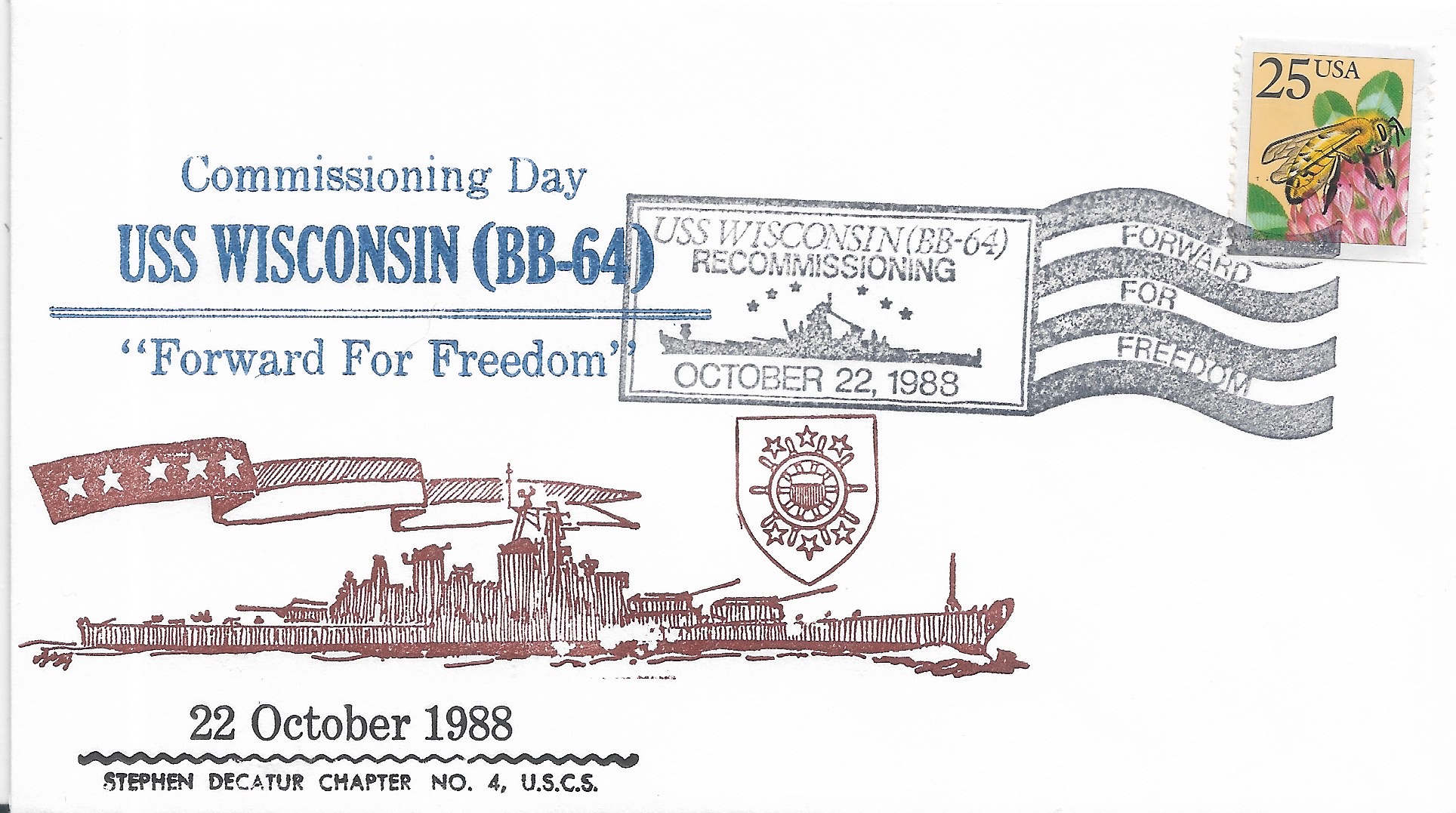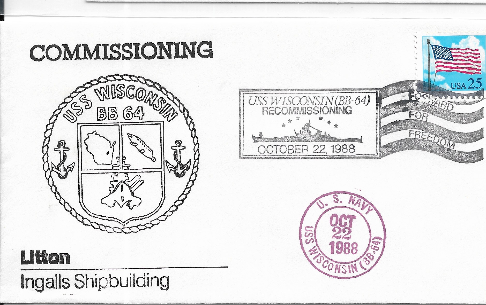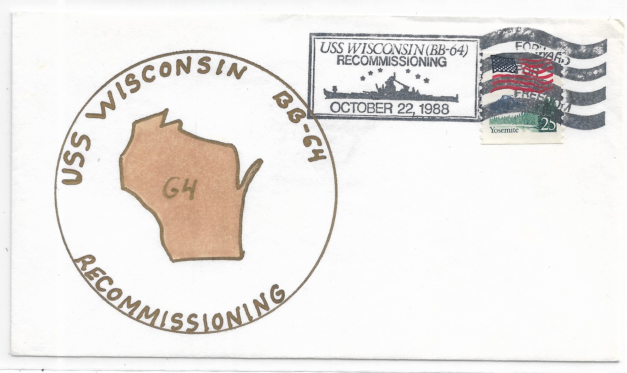 1988 USS Wisconsin BB-64, Recommissioned Hand Colored cachet. Added Sunday, October 12, 2025