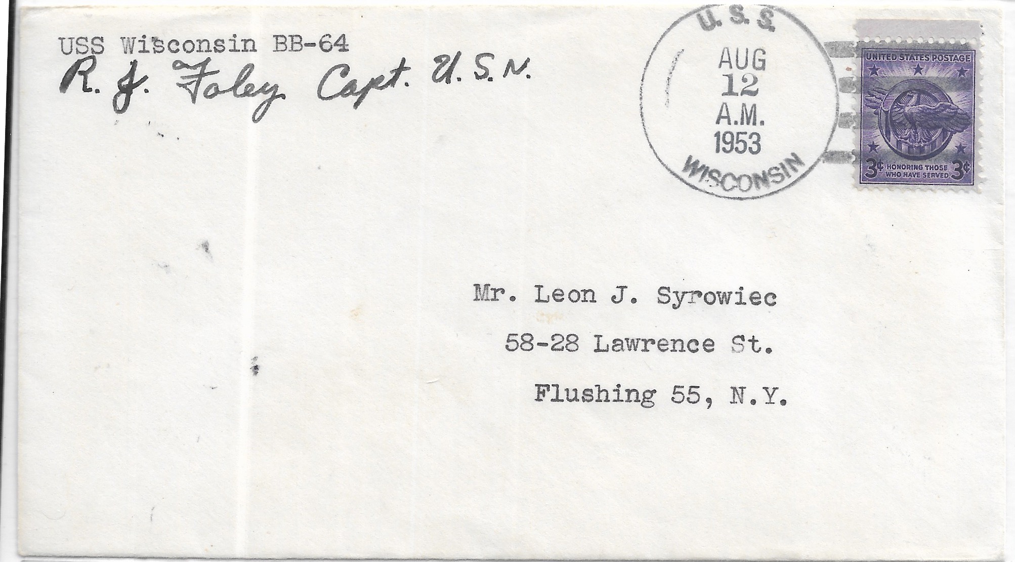 1953 USS Wisconsin BB-64 to Flushing, NY signed by C.O. Added Sunday, October 12, 2025