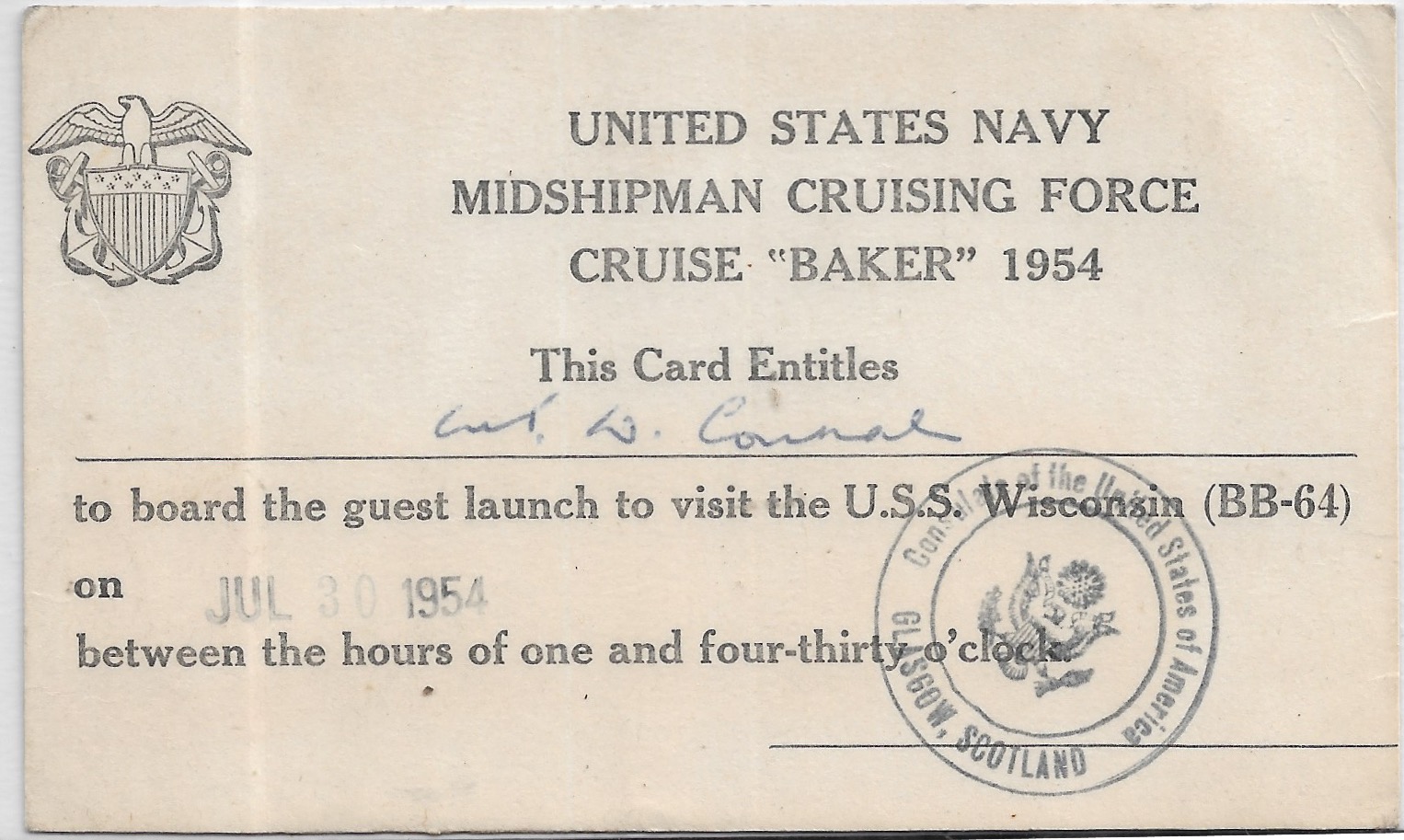 1954 USS Wisconsin BB-64, Midshipman Cruise "Baker" Invitiation. Added Sunday, October 12, 2025