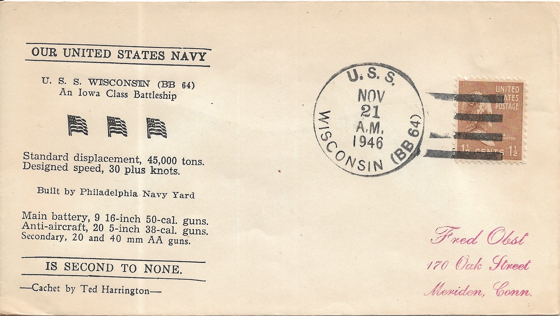 1946 USS Wisconsin BB-64 to Meriden, Ct Harrington cachet. Added Sunday, October 12, 2025