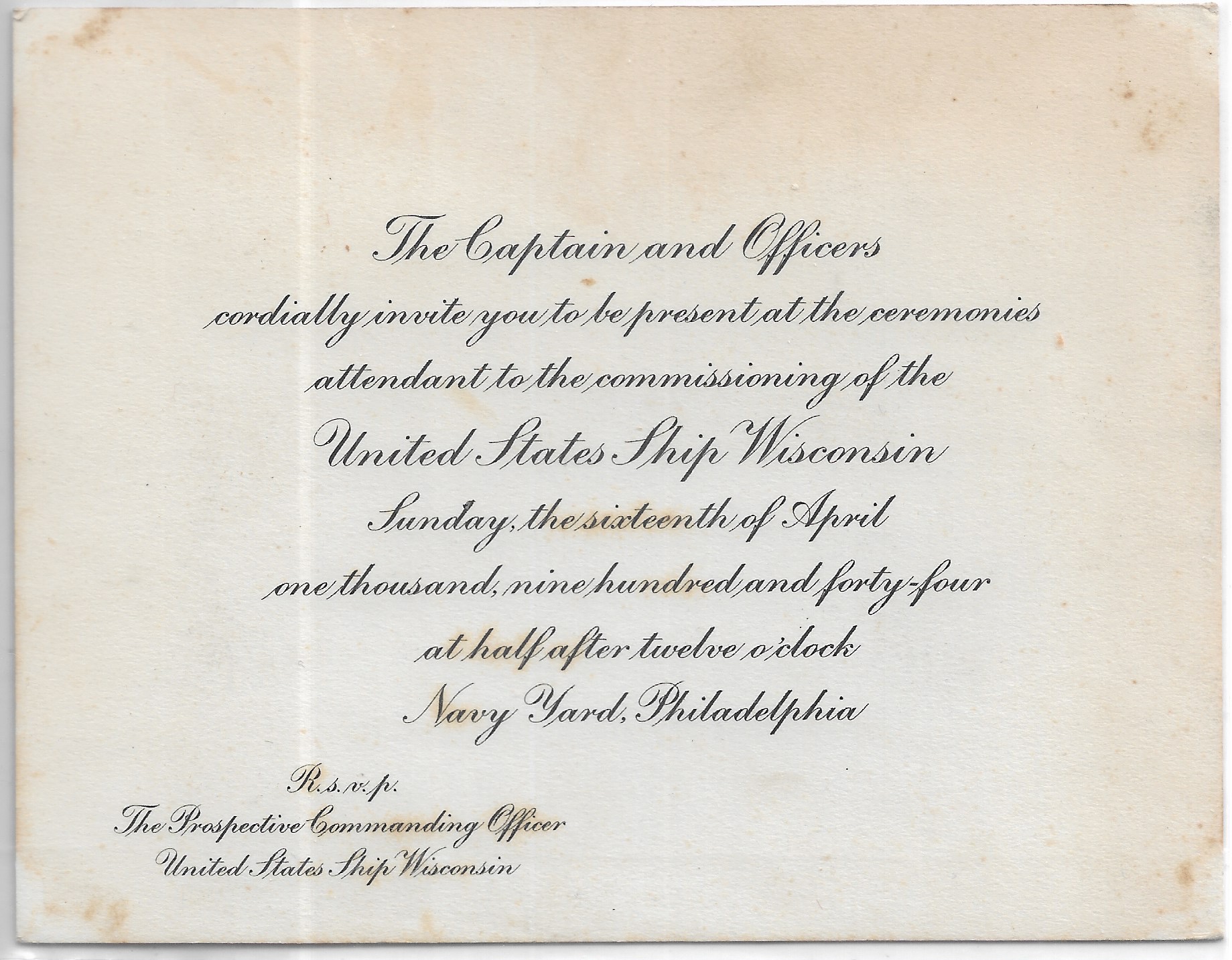 1944 USS Wisconsin BB-64 Commissioning Invitation. Added Sunday, October 12, 2025