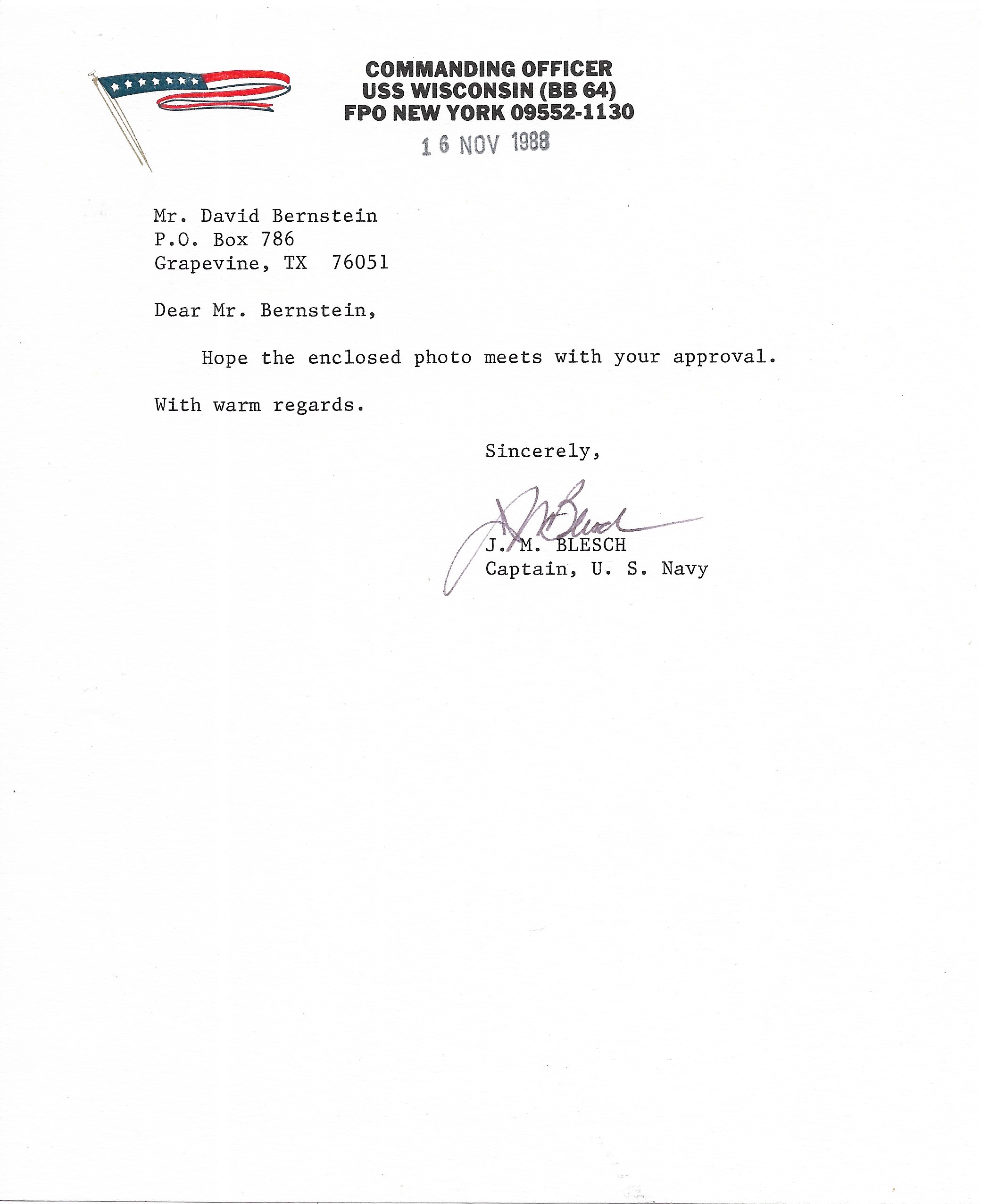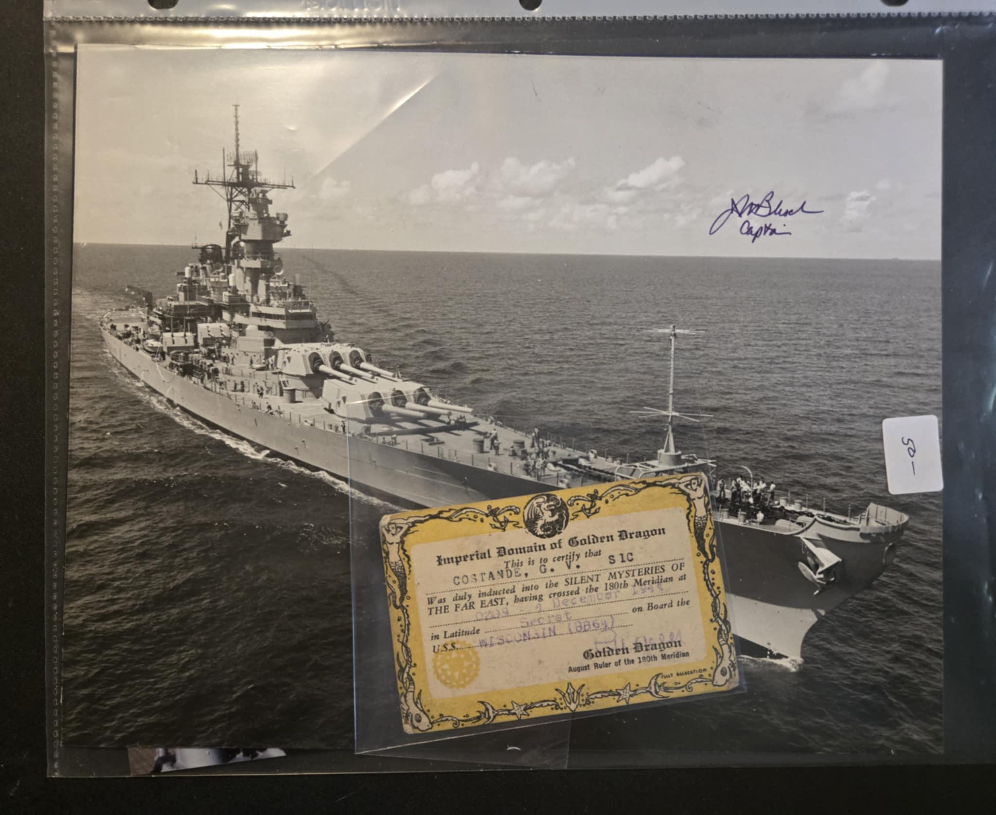 USS Wisconsin BB-64 Photos, Letter signed by C..O. and Golden Dragon Card. Added Sunday, October 12, 2025