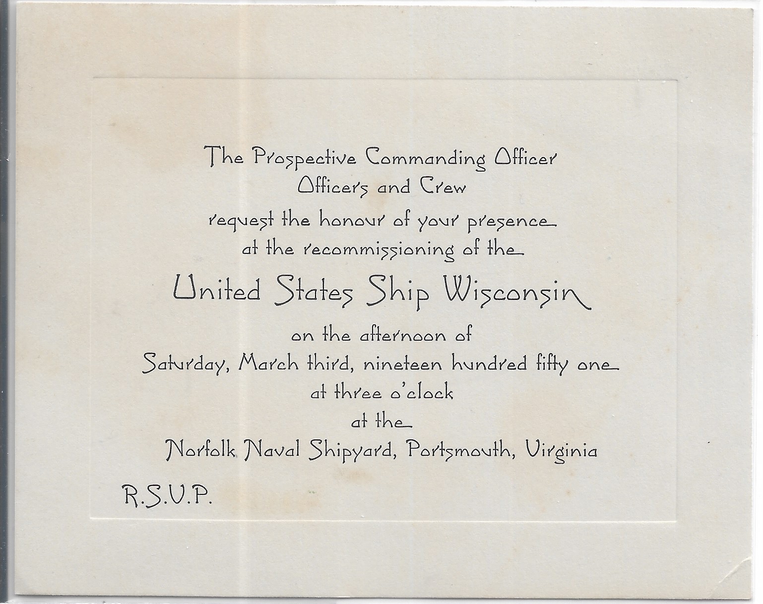 1951 USS Wisconsin BB-64, Recommissioning Invitation. Added Sunday, October 12, 2025