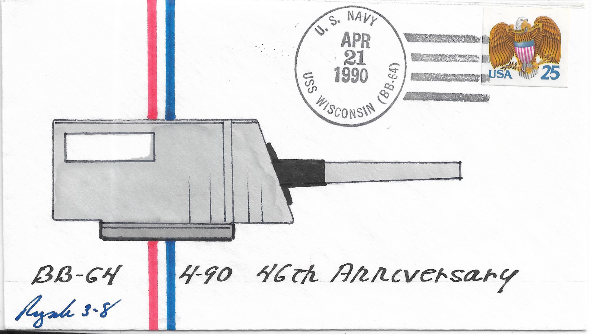 1990 USS Wisconsin BB-64, 46th Anniversary Hand Colored cachet. Added Sunday, October 12, 2025