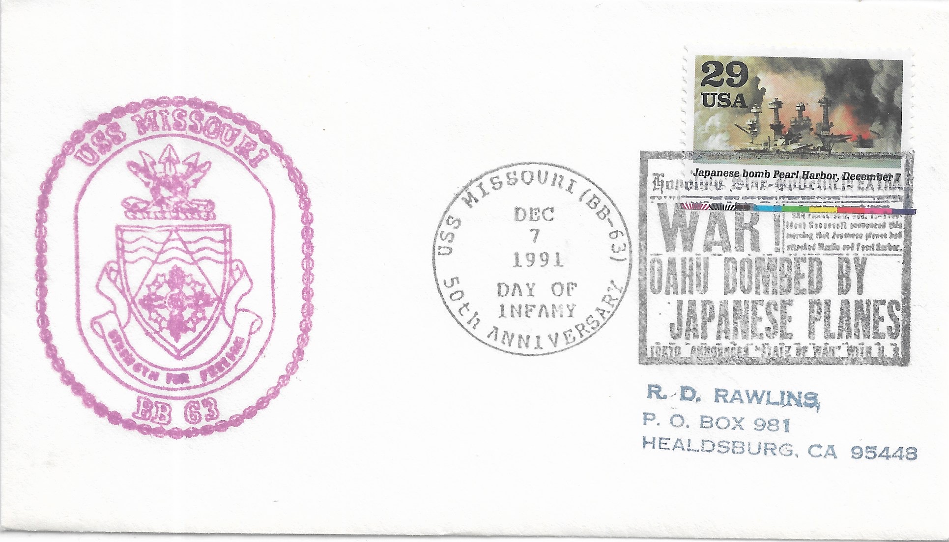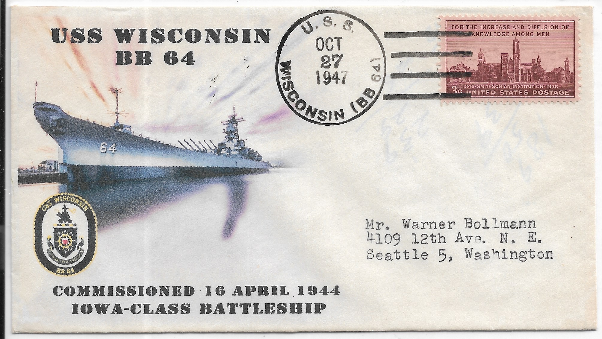 19446 USS Missouri BB-63 to Seattle, Wa Nice Colorful cachet. Added Sunday, October 12, 2025