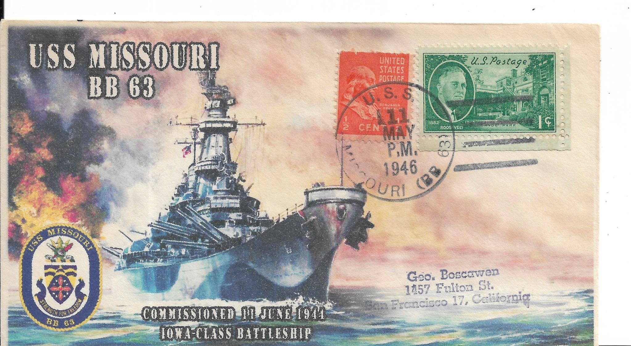 19446 USS Missouri BB-63 to San Francisco, Ca Nice Colorful cachet. Added Sunday, October 12, 2025