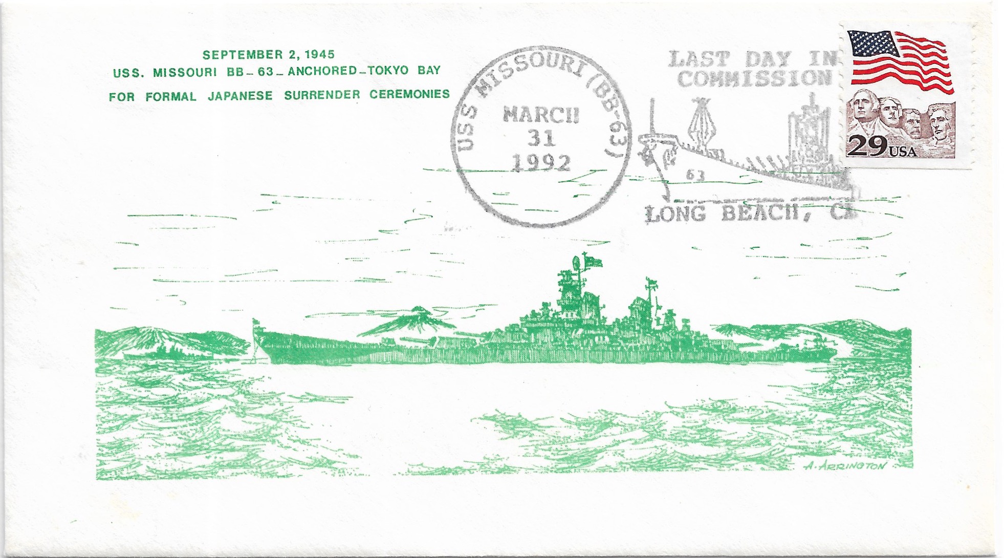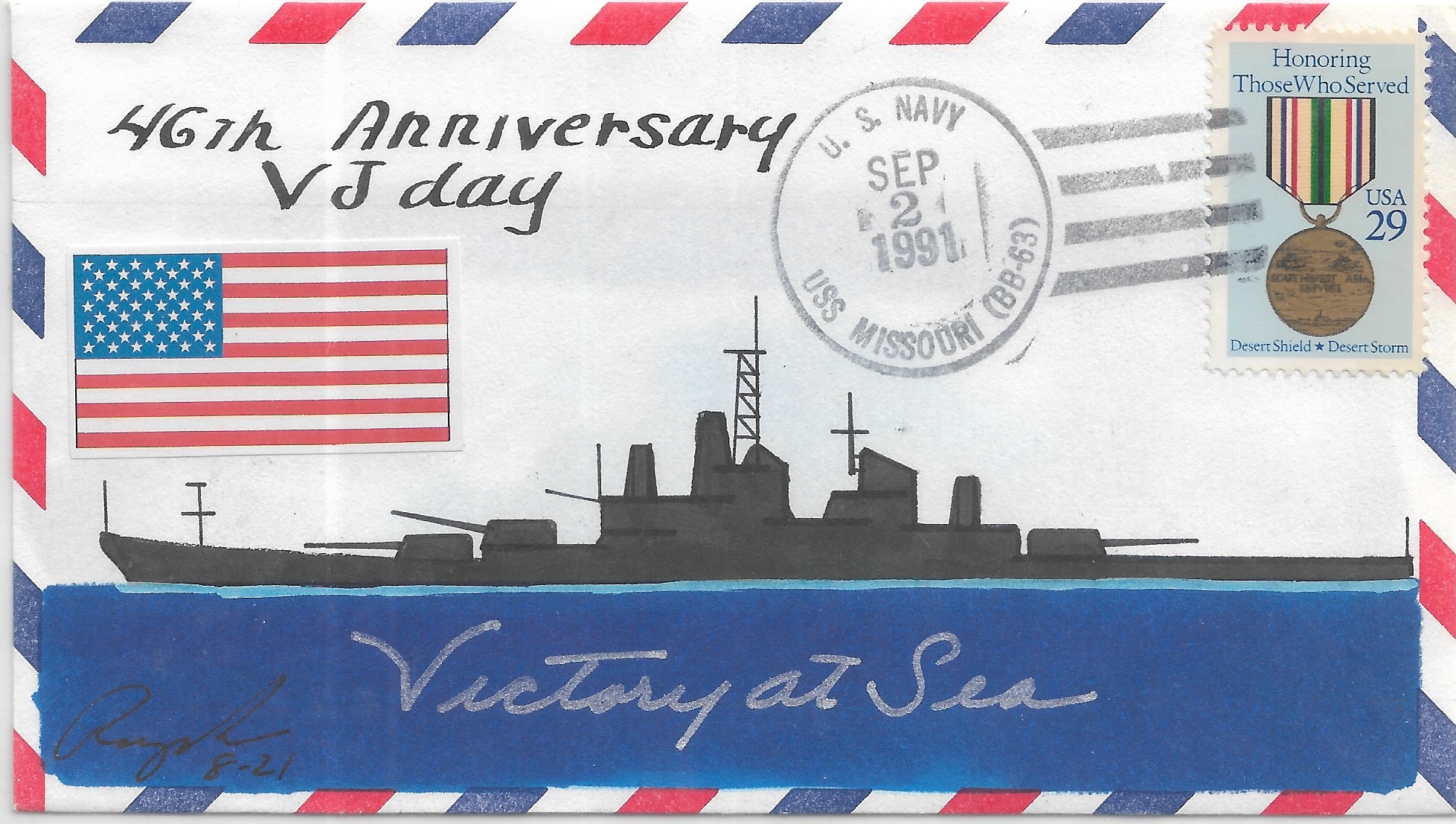 1991 USS Missouri BB-63, 46th Anniversary of VJ Day Hand Colored. Added Sunday, October 12, 2025