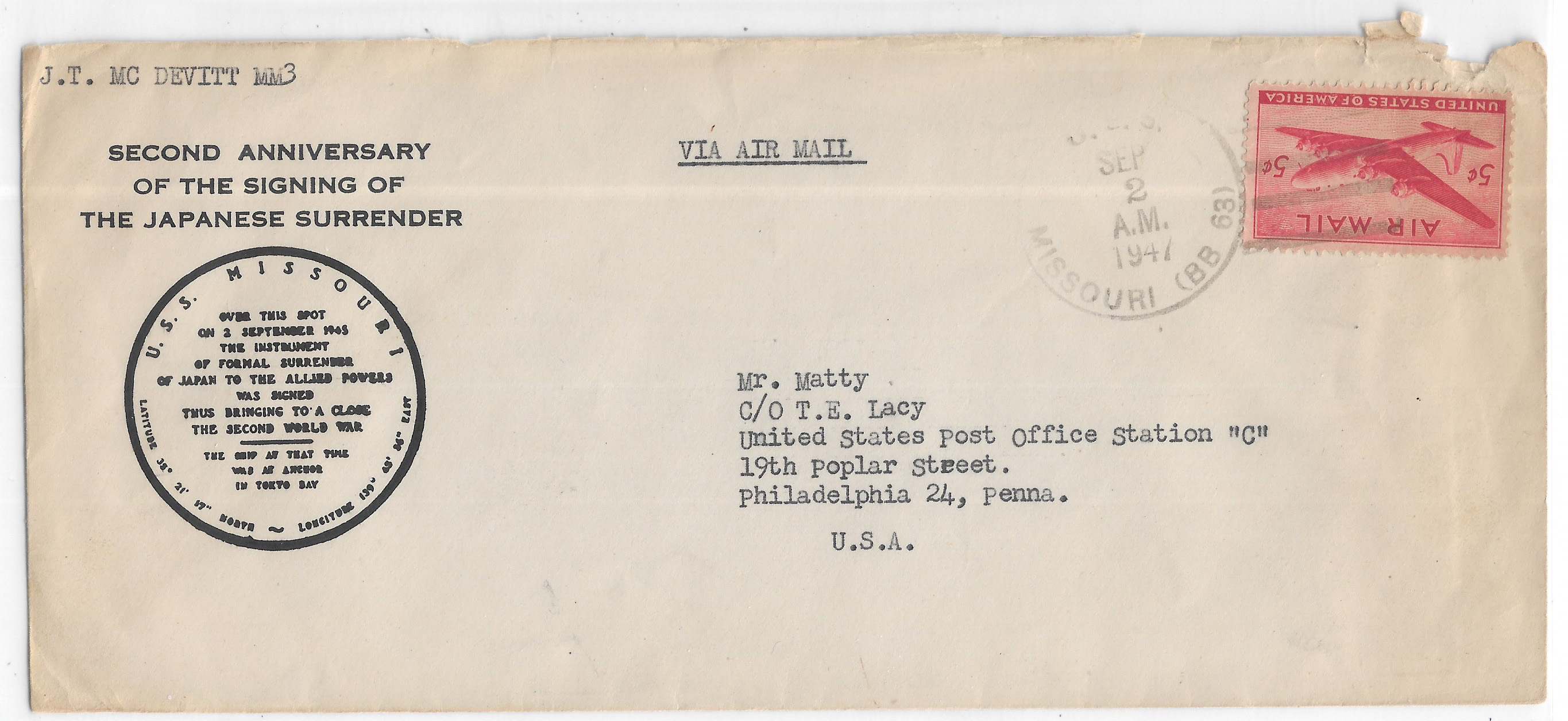 1947 USS Missouri BB-63, 2nd Anniversary of VJ Day to Philadelphia, Pa. Added Sunday, October 12, 2025