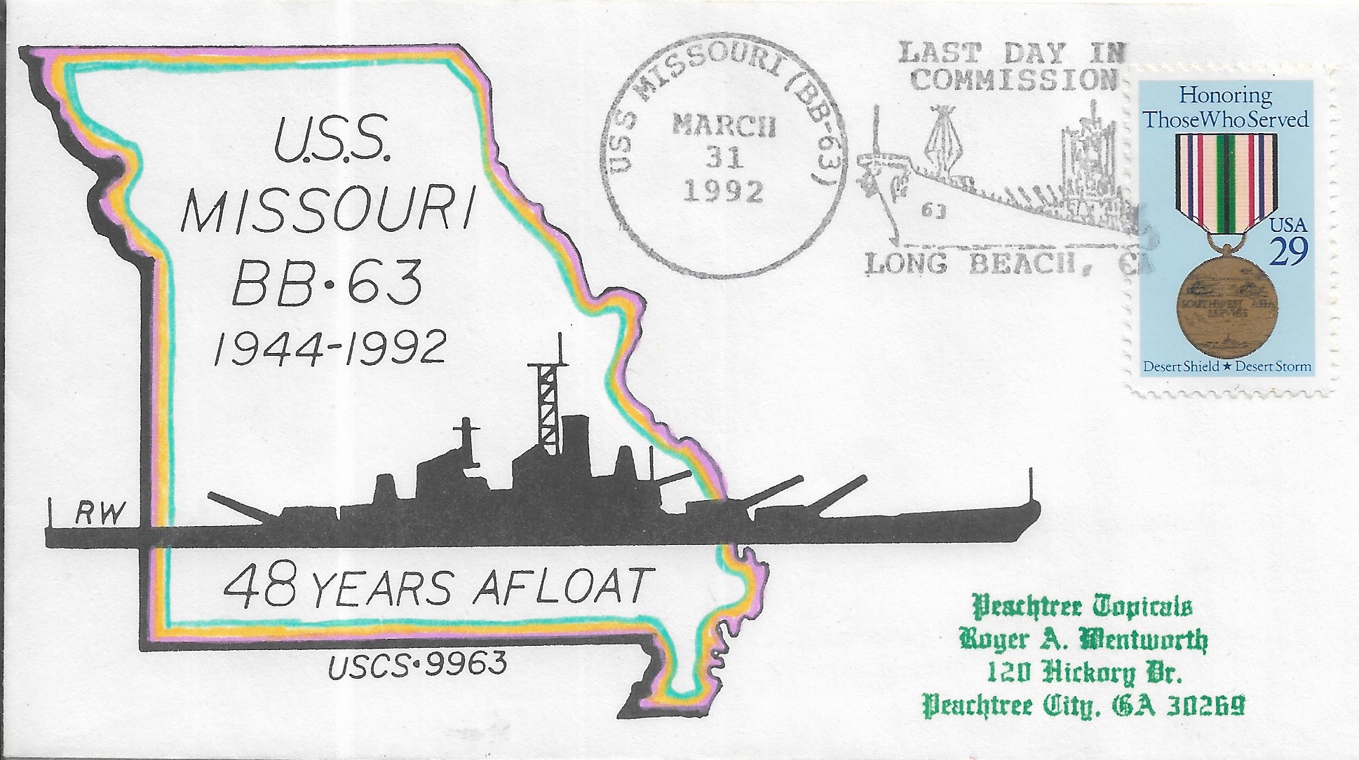 1992 USS Missouri BB-63, 48 Years Afloat to Peachtree, Ga Hand Colored. Added Sunday, October 12, 2025