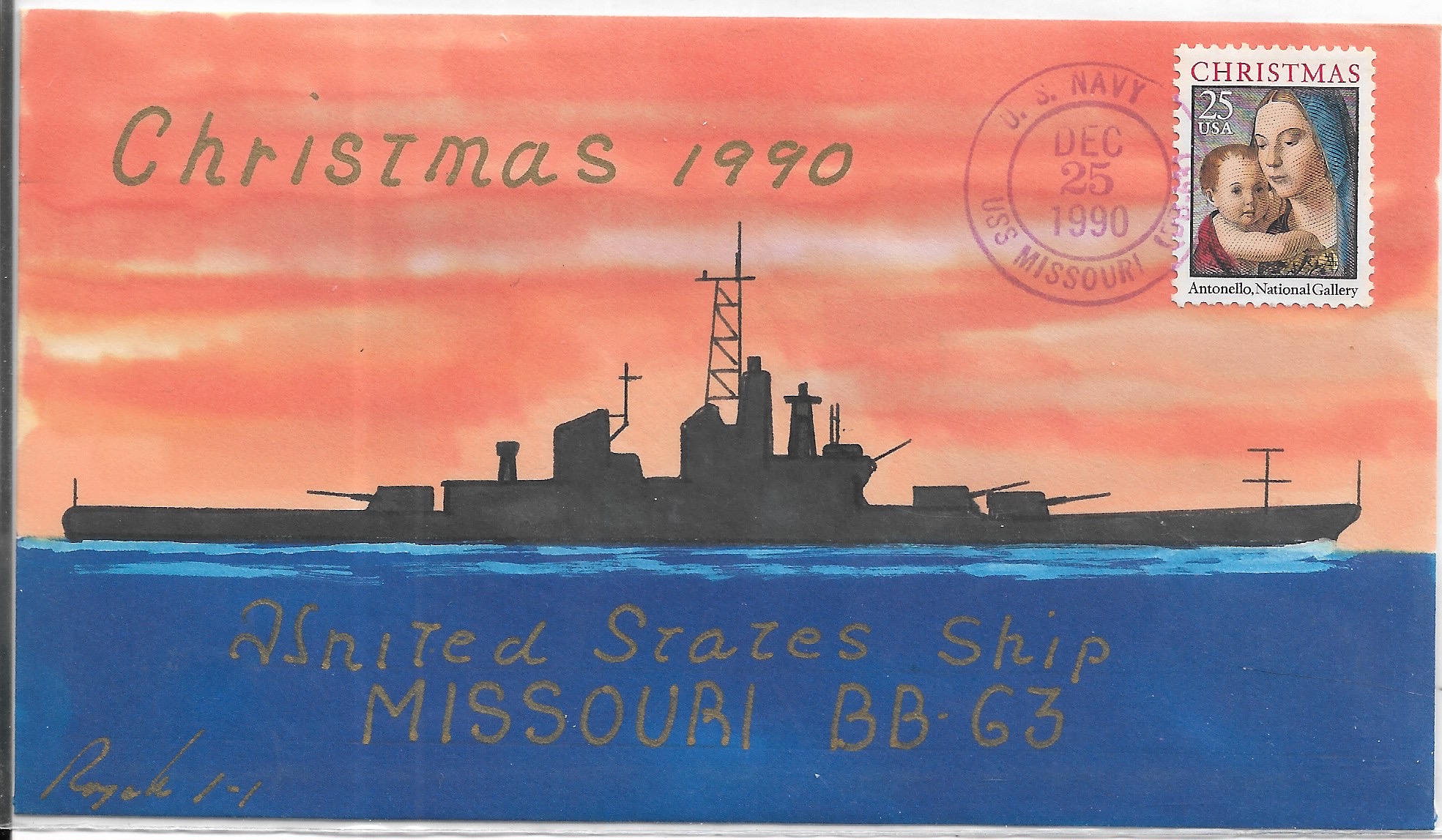 1990 USS Missouri BB-63, Christmas Hand Colored. Added Sunday, October 12, 2025