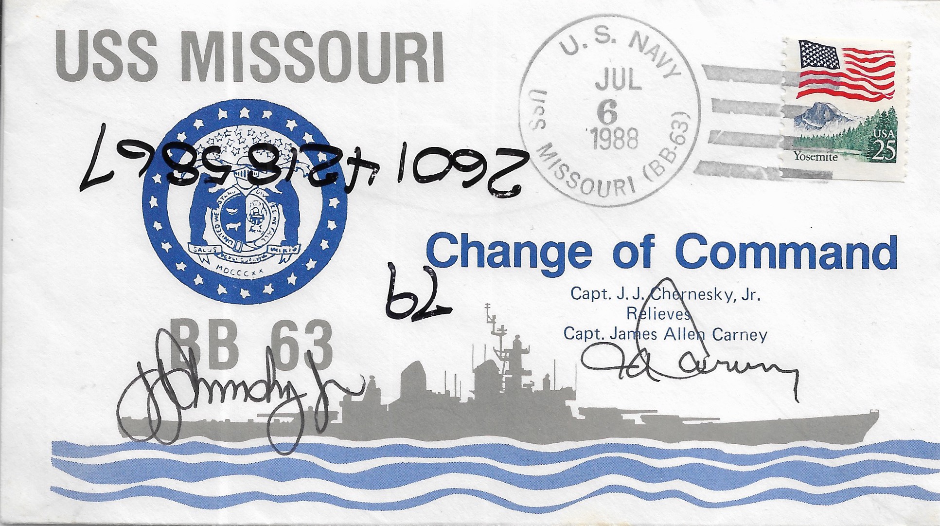 1988 USS Missouri BB-63, Change of Command signed by both C.O. Added Sunday, October 12, 2025
