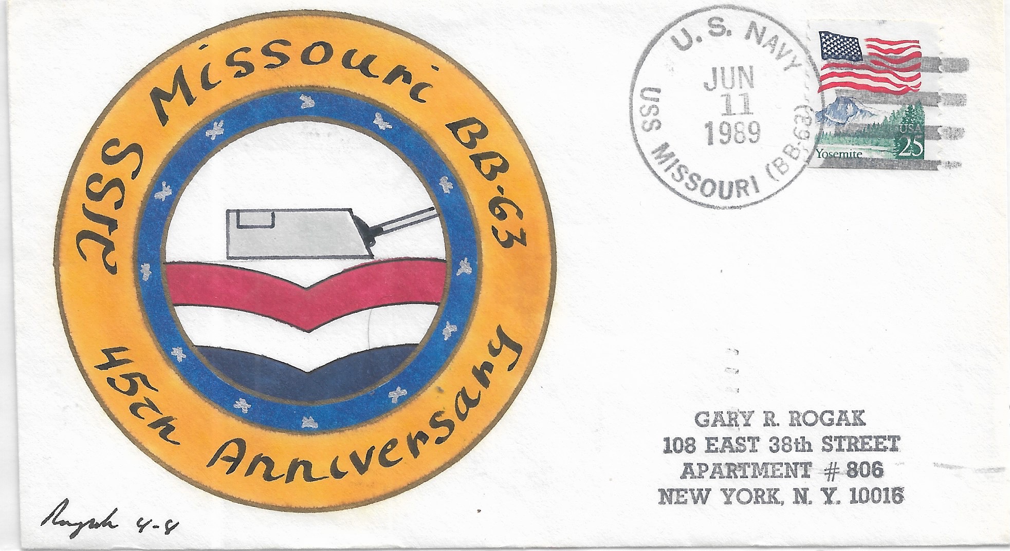 1989 USS Missouri BB-63, 45th Anniversary to New York, NY Hand Colored. Added Sunday, October 12, 2025
