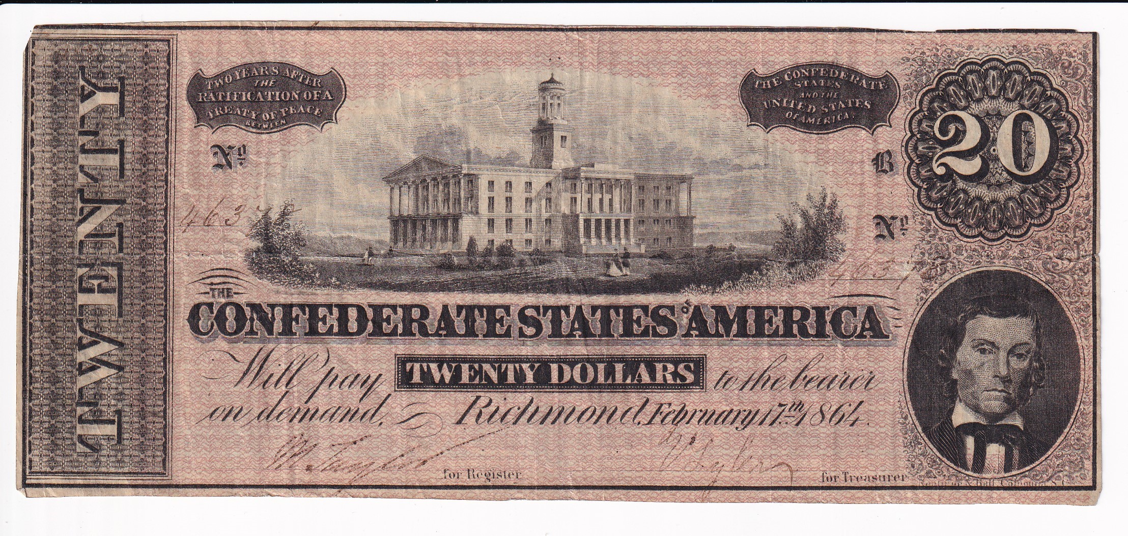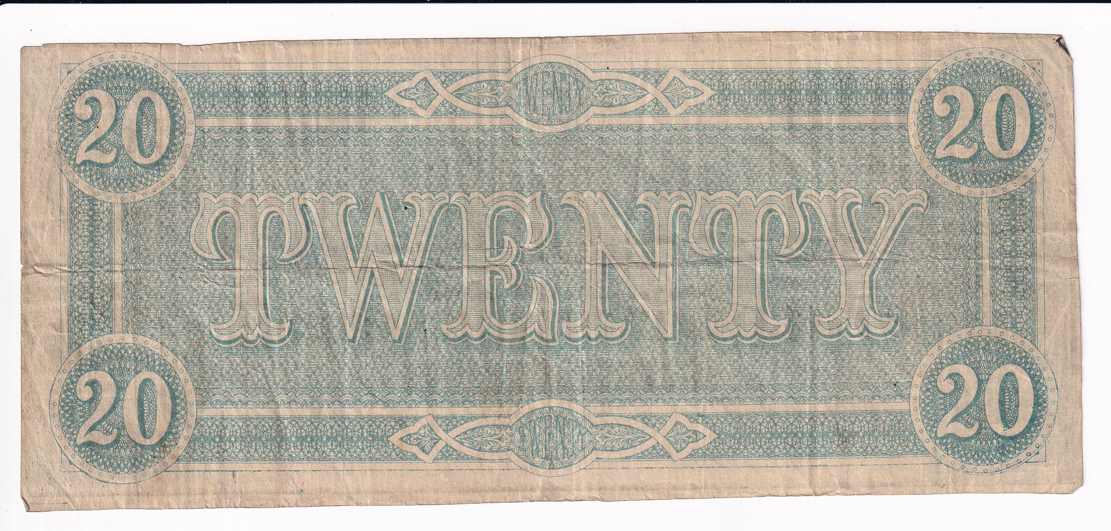 1864 $20 Confederate States Banknote, CS-67, VF. Added Sunday, December 28, 2025