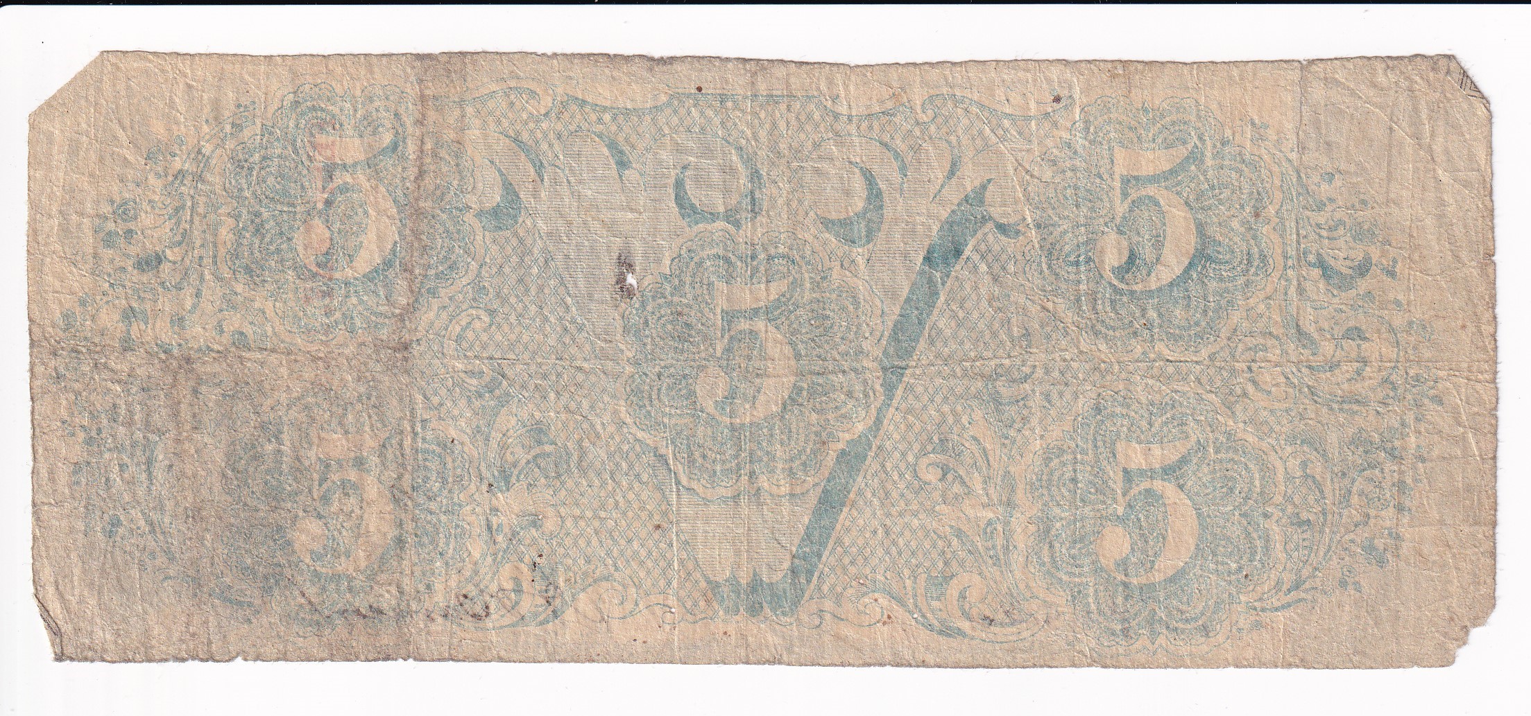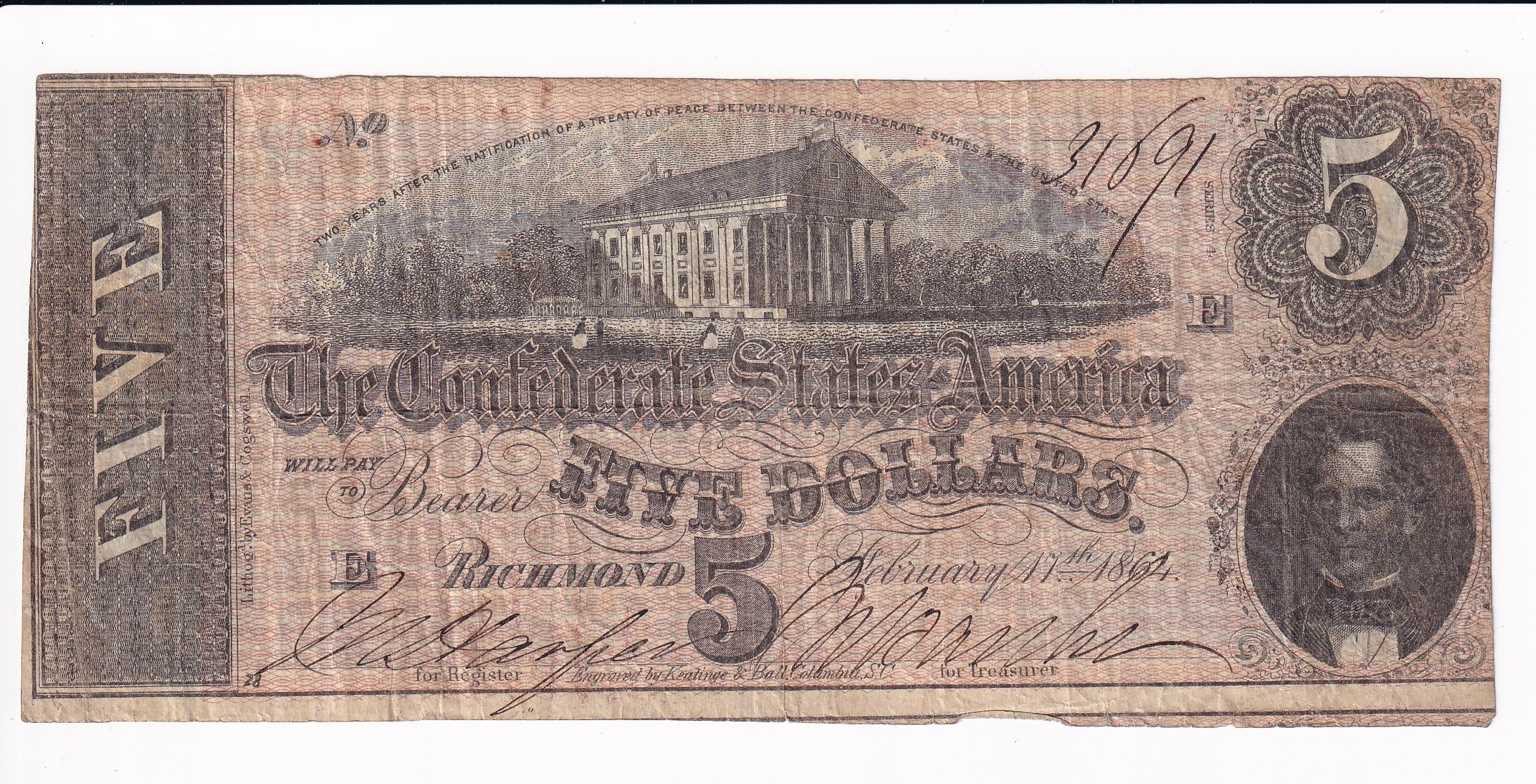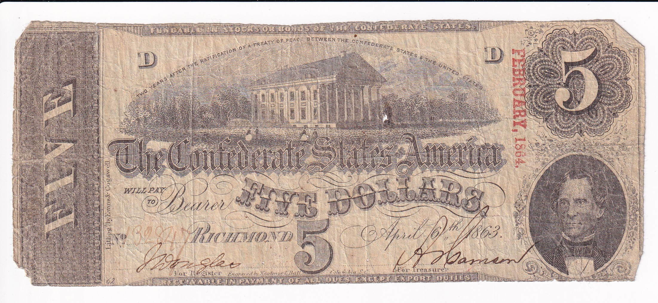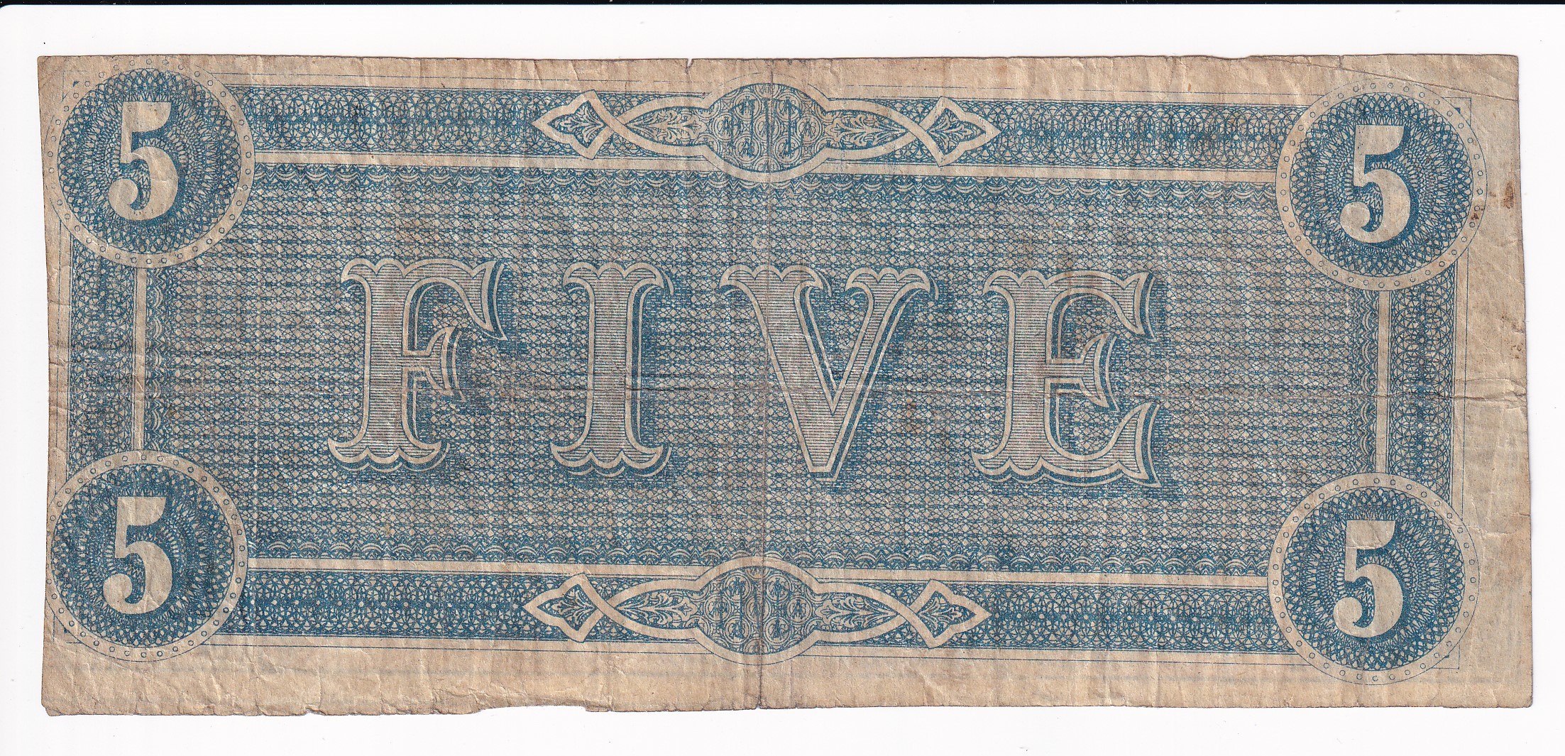 1864 $5 Confederate States Banknote, CS-69, Fine. Added Sunday, December 28, 2025