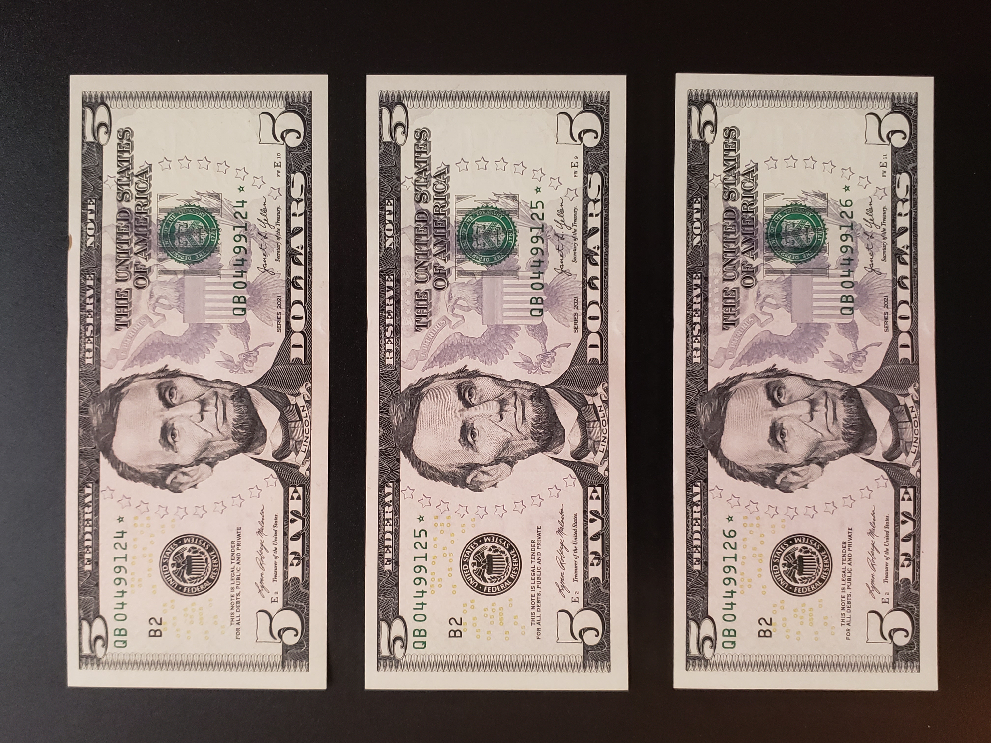 3 1999-B $5 Federal Reserve Star Note, Consecutive Numbers. Added Thursday, December 25, 2025