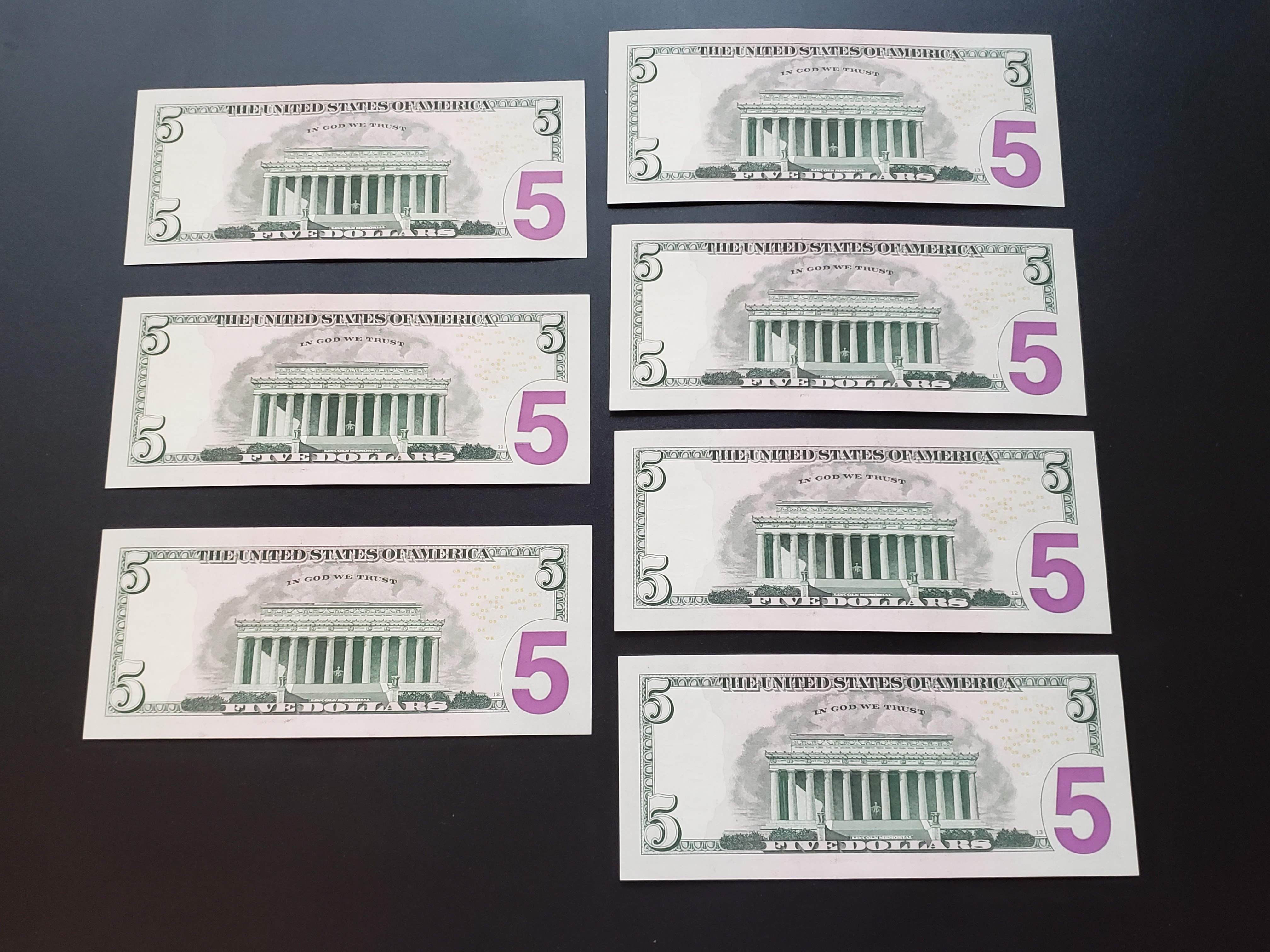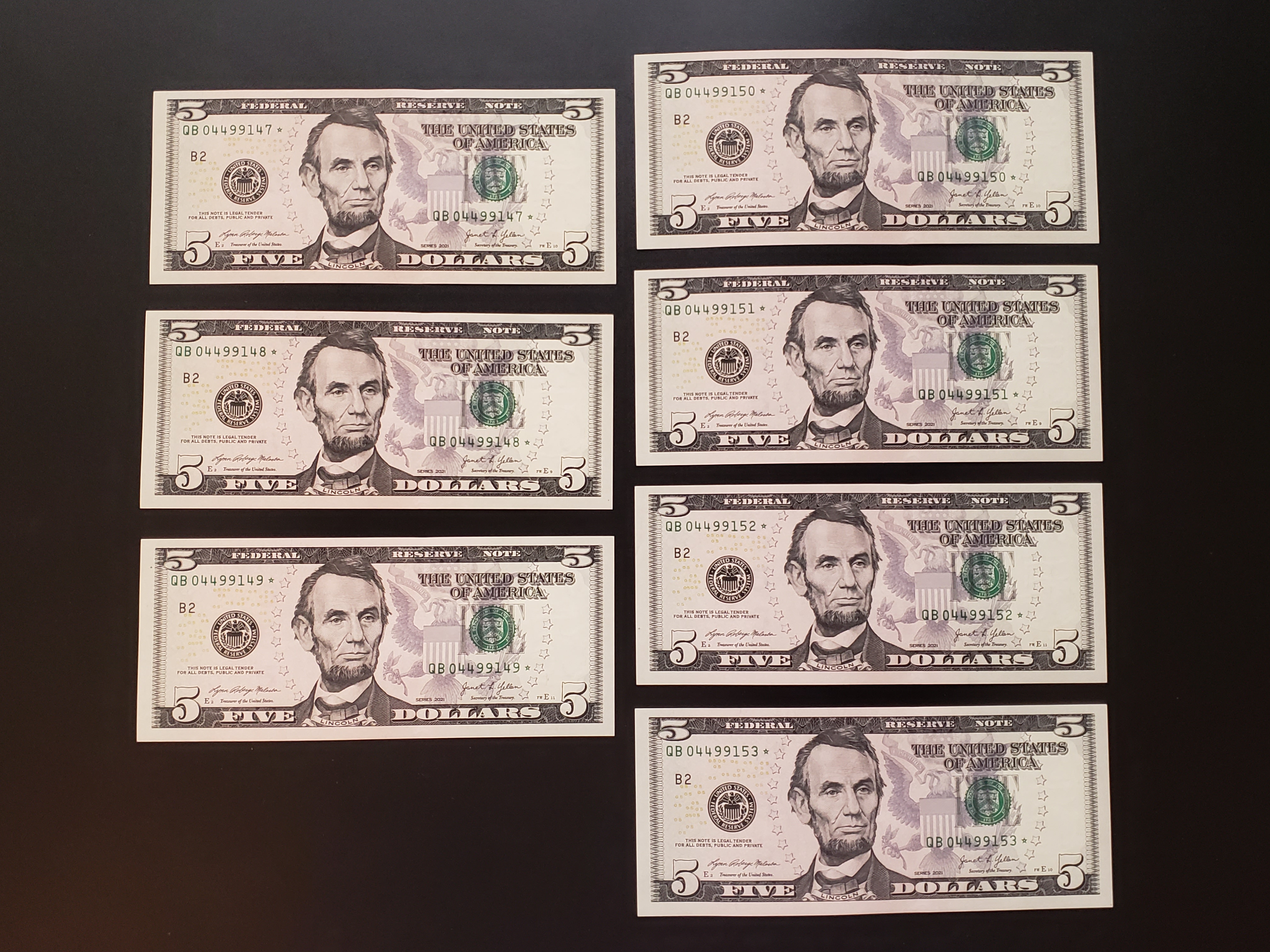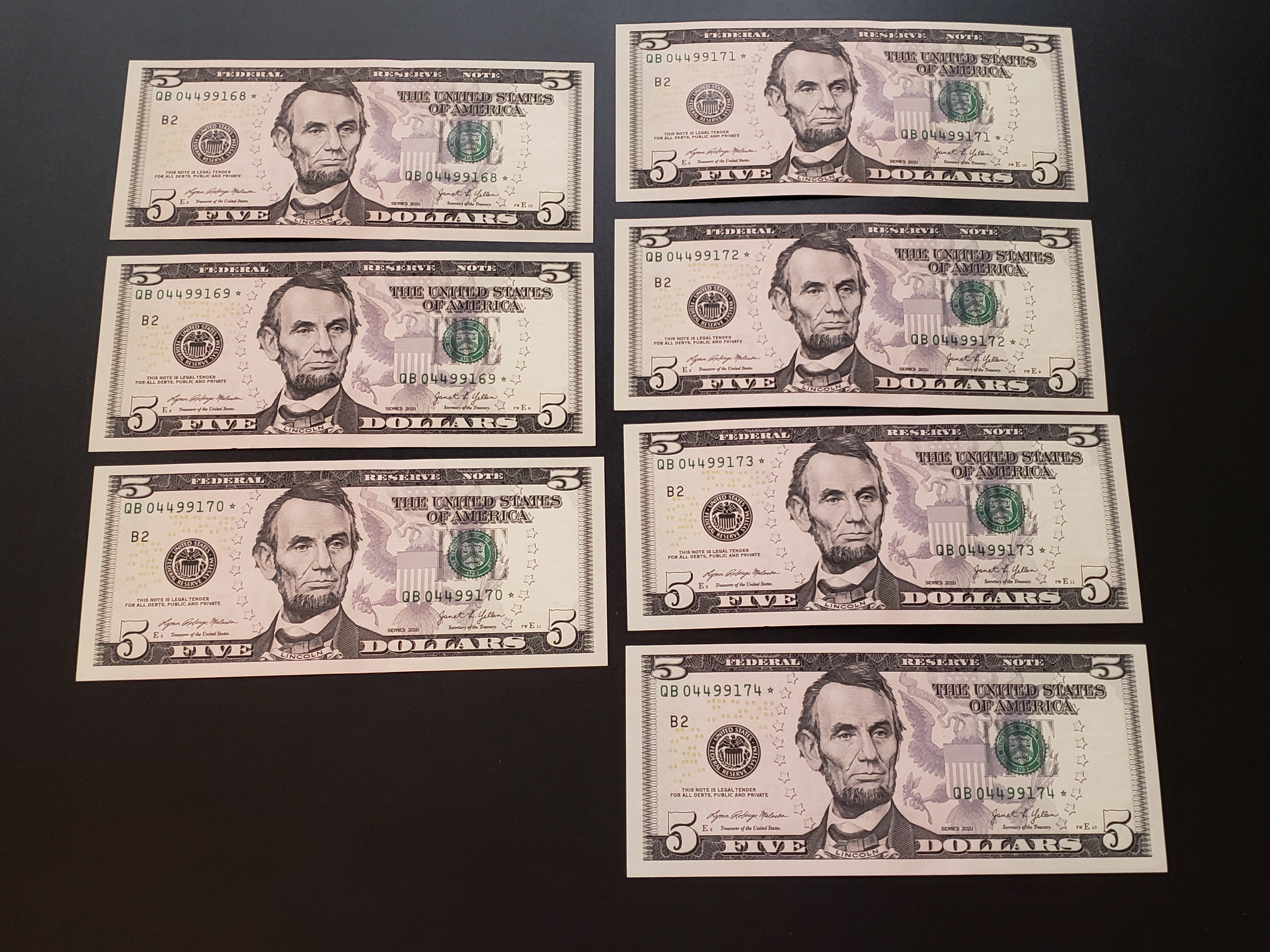 7 1999-B $5 Federal Reserve Star Note, Consecutive Numbers. Added Thursday, December 25, 2025