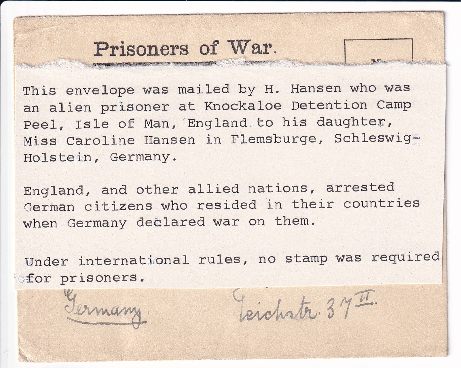 194x Civilian Internee, Knockaloe Camp, Peel, Isle of Man to Flensburg, Germany. Added Thursday, December 25, 2025
