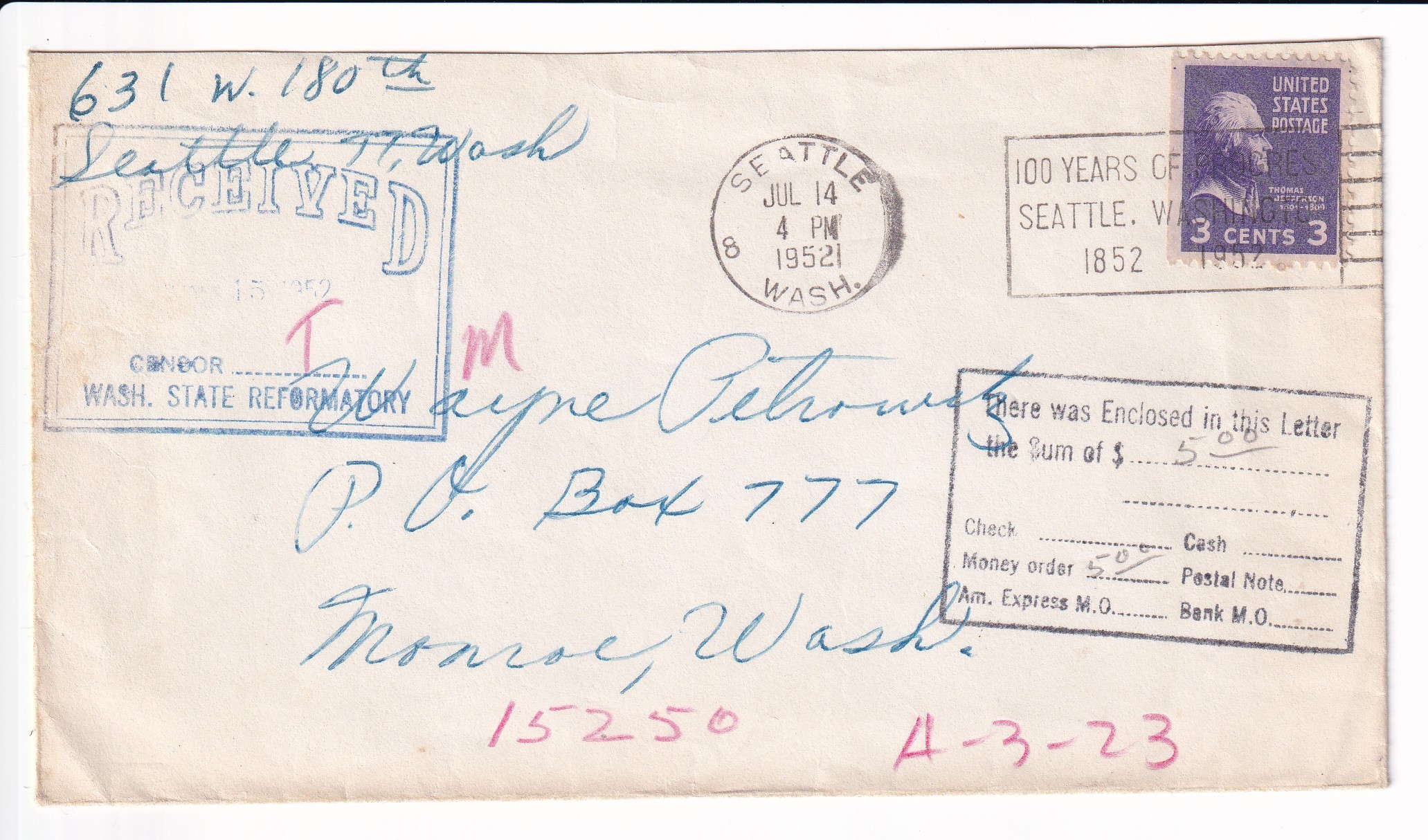 1952 Seattle, Wa to Washington State Prison, Monroe, Wa Censored solo 3c Prexie. Added Thursday, December 25, 2025