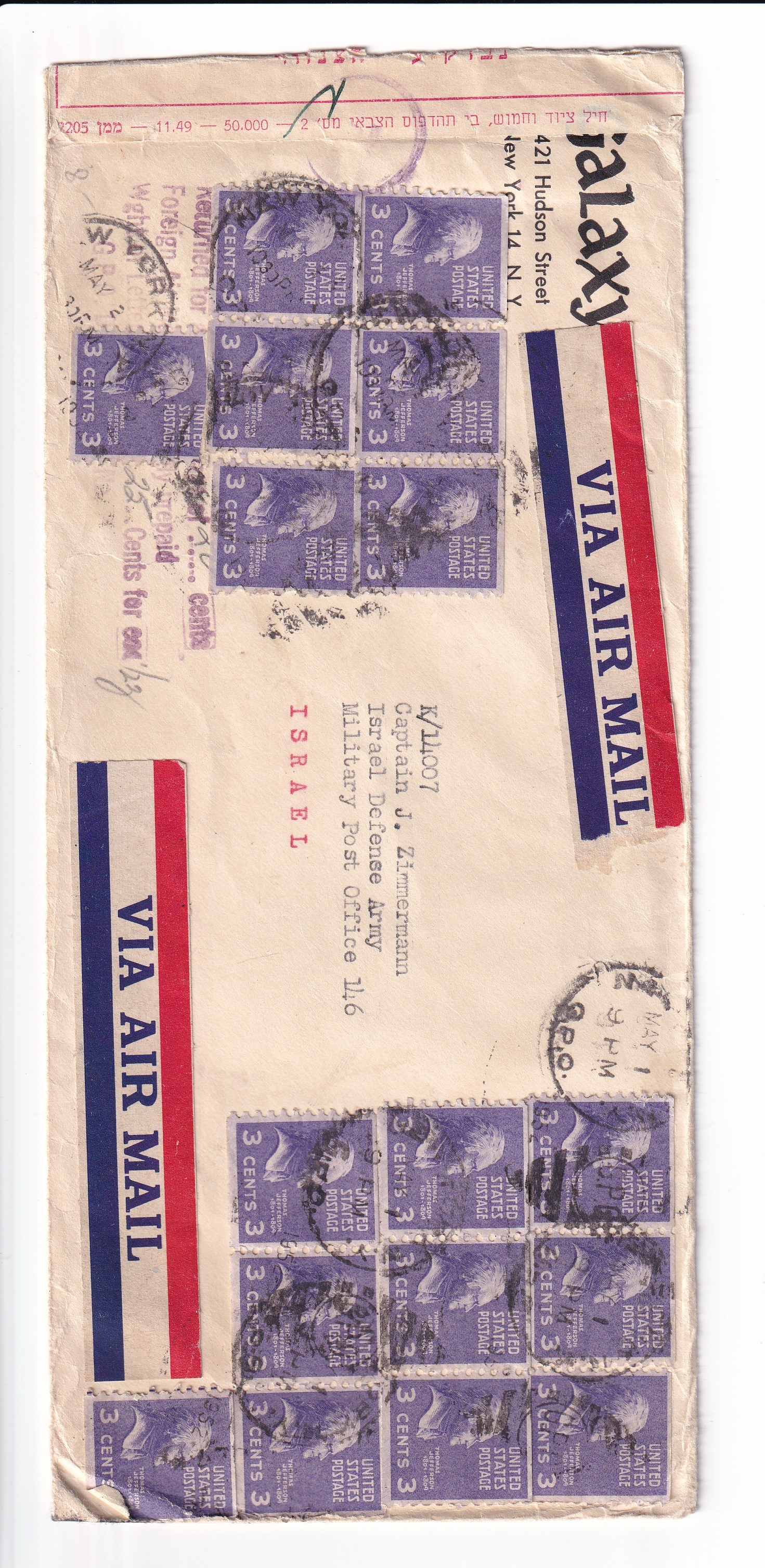 1952 New York, NY to Israel Defense Military Post 146, Israel Censored Airmail Lots of 3c Prexies. back stamped Tel-Aviv. Added Thursday, January 1, 2026